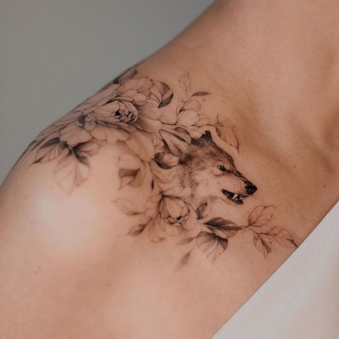 Das zweite häufige Thema bei Tätowierungen für Mädchen sind Blumen. Sie können sowohl oben und unten auf der Brust als auch an der gesamten Seite angebracht werden. Es ist jedoch zu bedenken, dass in diesem Fall die Linienführung mit anderen Stilen kombiniert wird und mehrere helle Farbtöne während der Arbeit verwendet werden.