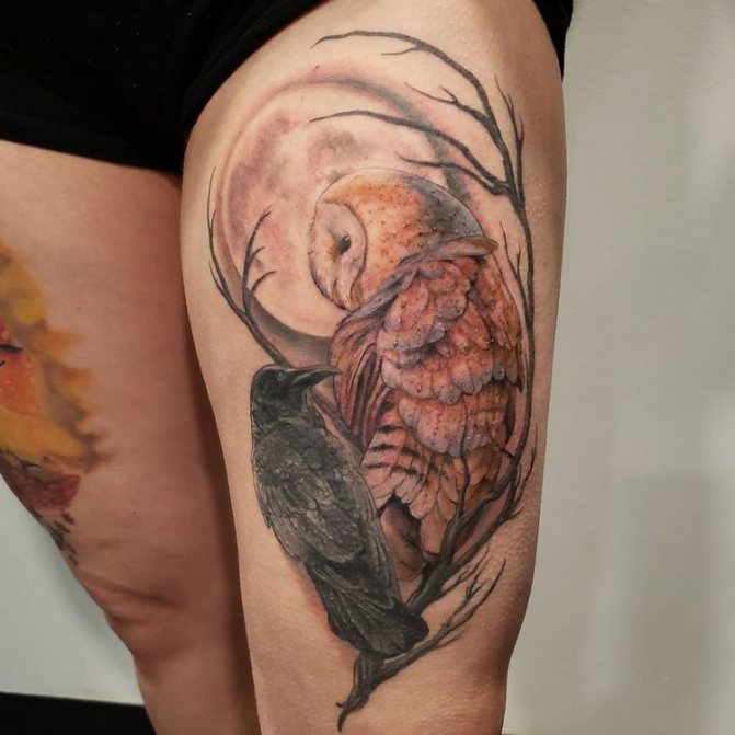 Die begehrteste und beliebteste Stelle für Mädchen, um die Eule tätowieren zu lassen, ist auf der Vorderseite des Oberschenkels. Aufrecht sitzend und mit seinen großen Augen schauend, passt der Vogel perfekt in diese Größe. Außerdem lässt sich dieser Teil des Körpers im Falle einer strengen Kleiderordnung leicht drapieren.