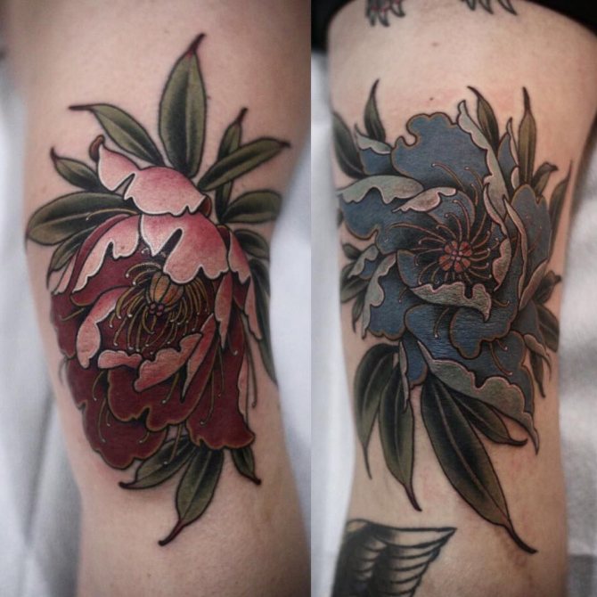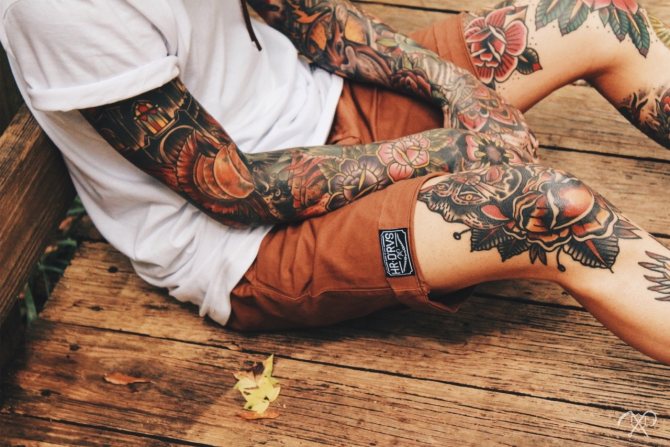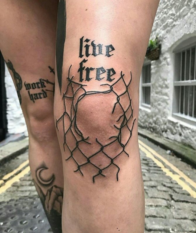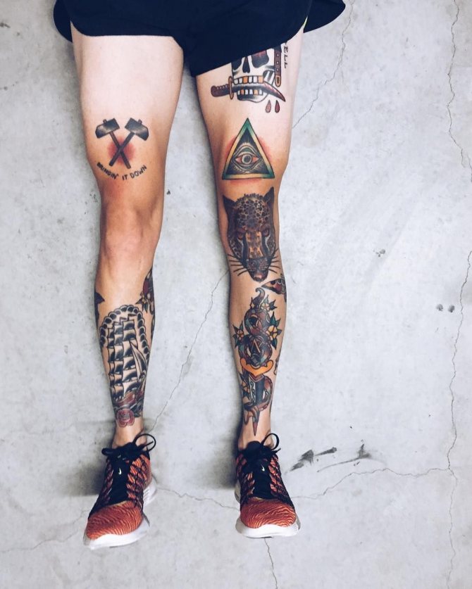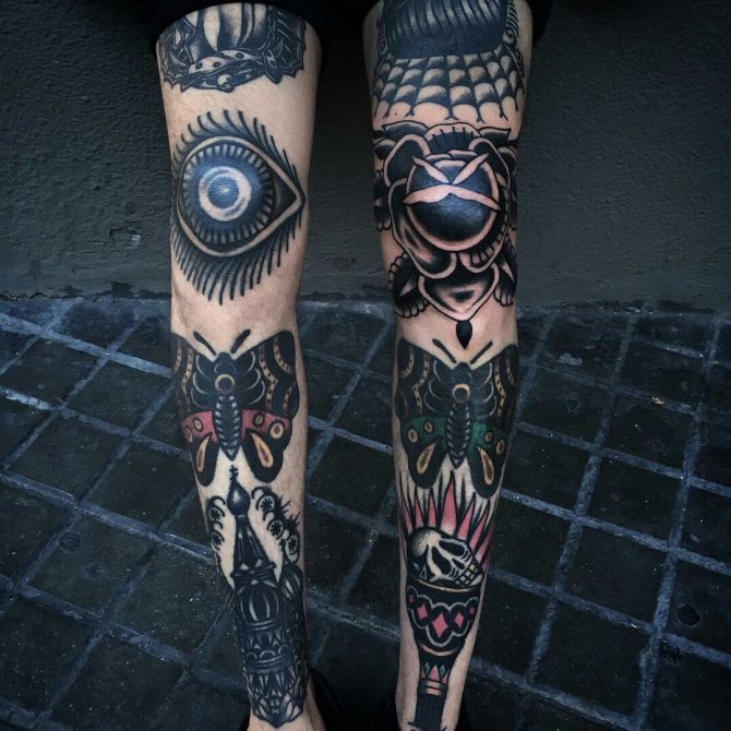 Die Gestaltung der Knietätowierung sowie die Symbolik der Motive hängen von der Wahl des Musters ab. Monochrome Designs werden mit feinen grafischen Linien hergestellt und können aus geometrischen Formen bestehen. Oldschool ist ideal für Anker, Totenköpfe oder Tiere. Orientalisch oder biomechanisch wird ursprünglich der Gelenkbereich mit einem anschaulichen Bild hervorgehoben. Littering ist die richtige Wahl für Phrasen und Schriftzüge. Aquarellfarben sind ideal, um Unregelmäßigkeiten im Relief auszugleichen. Auch ornamentale und barocke Gemälde sind sehr beliebt. Die Technik des Realismus sieht an den Knien nicht sehr schön aus, da die anatomischen Merkmale es nicht erlauben, alle Details vollständig darzustellen.