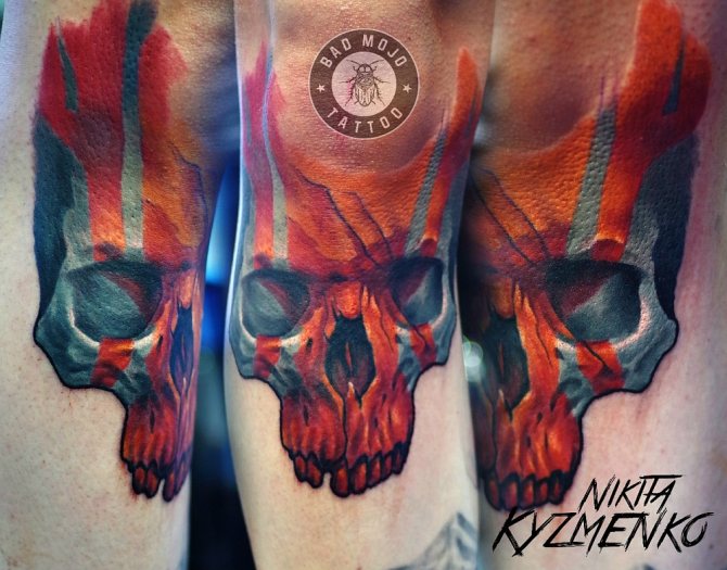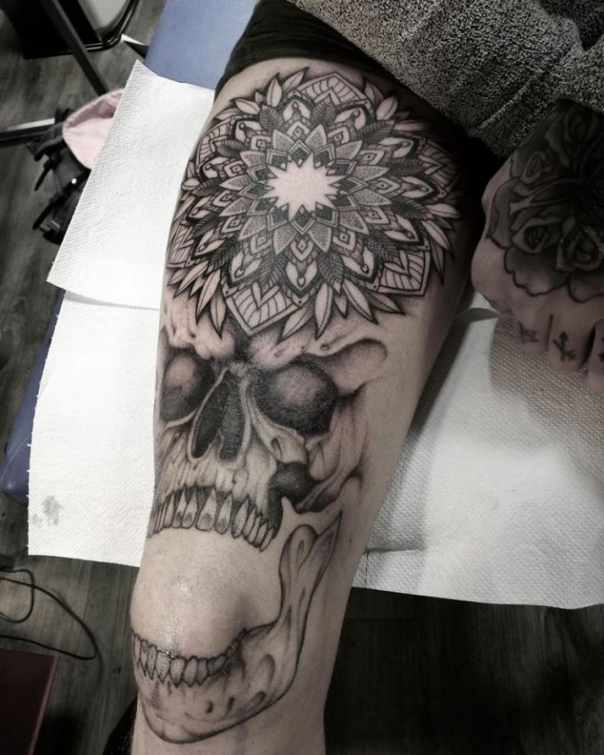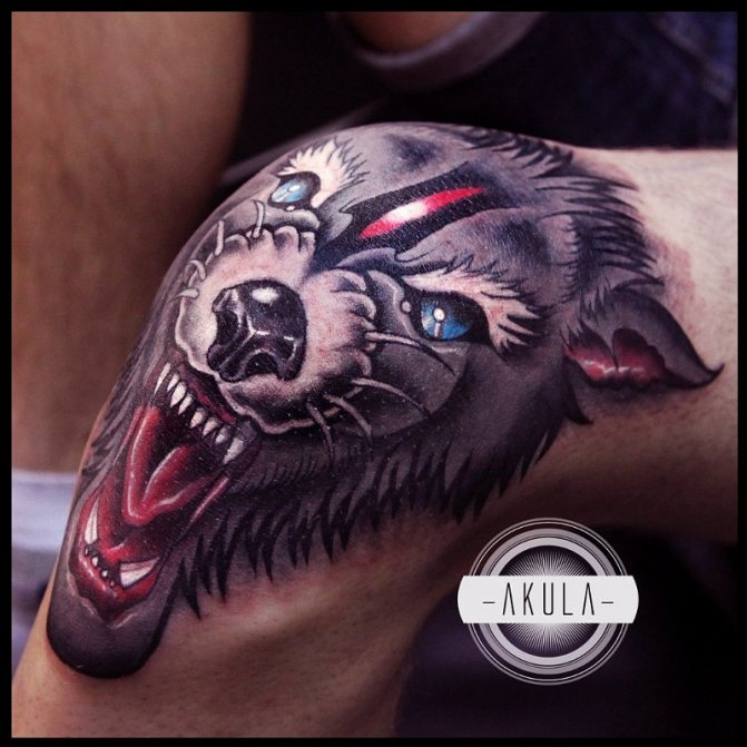 Fußbälle, Totenköpfe, Raubtiere, originelle Ornamente, einzigartige abstrakte Muster, Inschriften in Form eines Halbkreises sind nur einige der Ideen, mit denen Sie Ihr Knie "punkten" können. In den meisten Fällen handelt es sich um helle oder dunkle, kontrastreiche Bilder, die die gesamte Hautfläche am Kniegelenk einnehmen oder Teil einer großflächigen Komposition sind, deren Fortsetzung sich oberhalb und unterhalb des besprochenen Körperteils befindet.