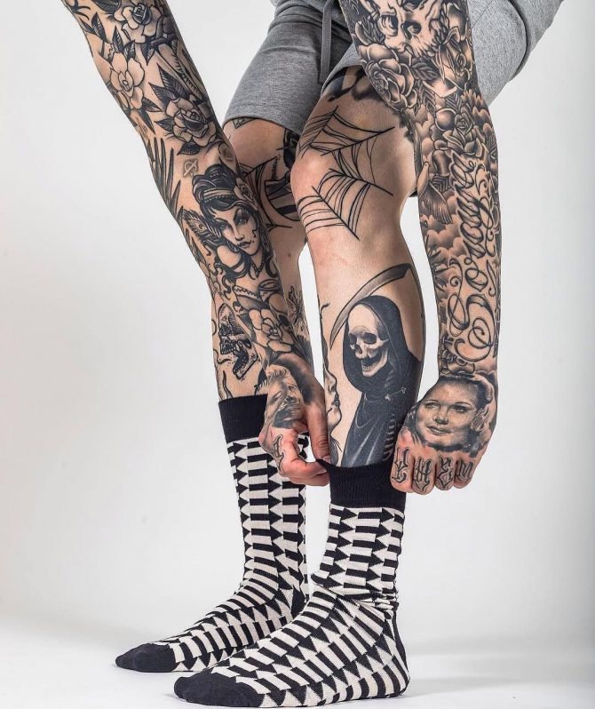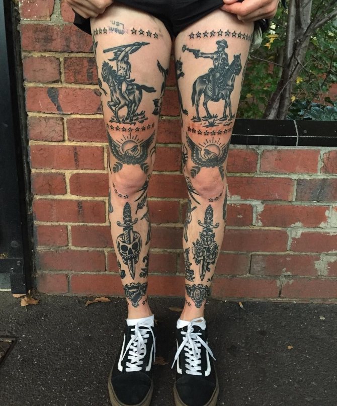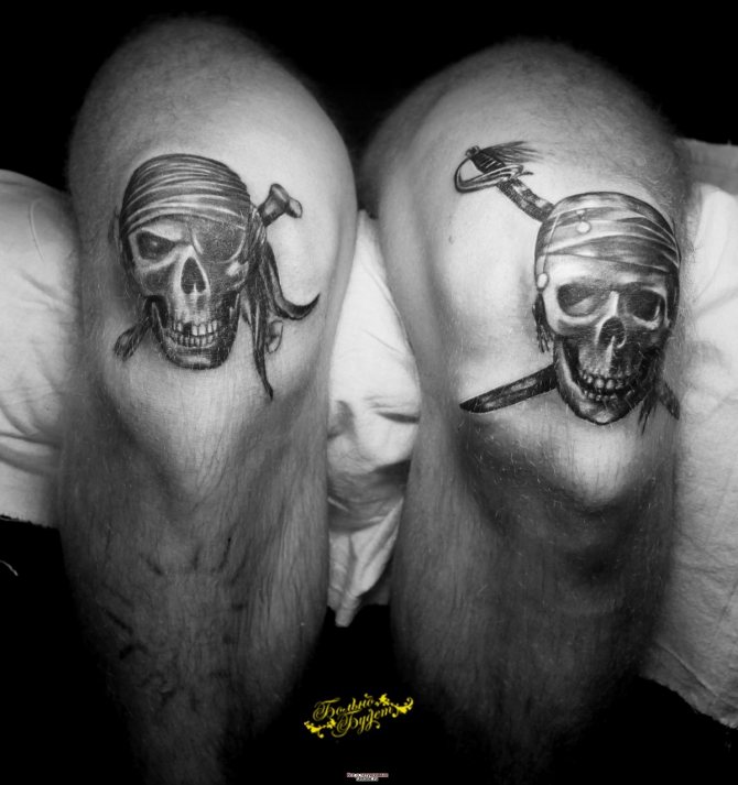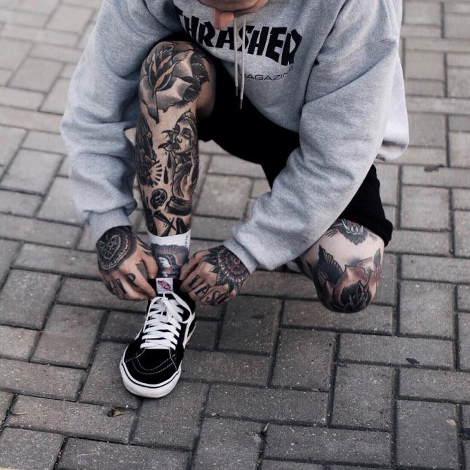 Männliche Vertreter können als die wichtigsten "Verbraucher" von Tätowierungen auf ihren Knien bezeichnet werden. Im Gegensatz zu den hübschen Damen schämen sie sich nicht für die "unvollkommene" Oberfläche dieses Körperbereichs. Im Gegenteil, eine Tätowierung auf dem Knie betont ihrer Meinung nach nur das Bein und verleiht dem Körper einen brutalen Touch, der jeden Kerl oder Mann maskuliner aussehen lässt.