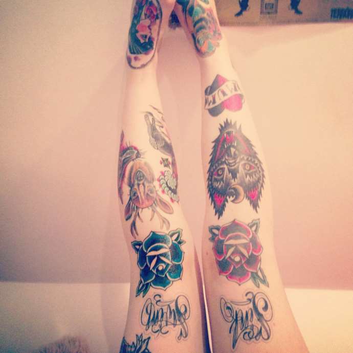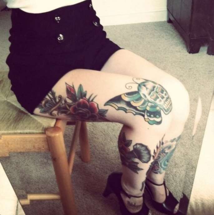 Das Knie ist wie jedes andere Gelenk sehr beweglich, was sich auf die Langlebigkeit des Bildes auswirkt. Die Grenzen von sehr kleinen Details können mit der Zeit einfach verschwimmen. Das Motiv kann ein beliebiges Thema haben und direkt in der Mitte des Knies, knapp über oder unter der Kniescheibe, platziert werden, oder es kann Teil eines großflächigen Motivs sein, das fast das gesamte Bein einnimmt.