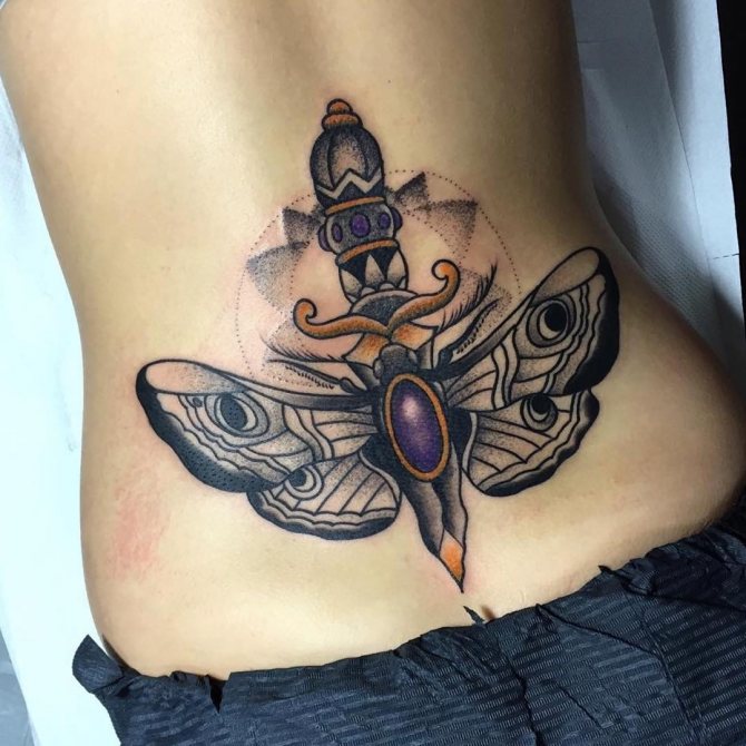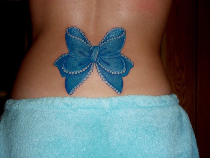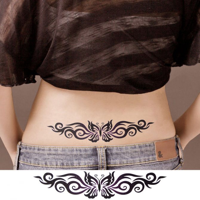 Der Schmetterling auf der Taille ist eine Tätowierung, die Liebe, Schönheit, Sorglosigkeit und Freiheit bedeutet. In der germanischen Kultur wird ihr die Bedeutung der Geburt neuen Lebens zugeschrieben, in China steht sie für absolute Harmonie in der Familie, in Japan ist sie ein Zeichen der Gnade. Die häufigste Interpretation der Bedeutung des Schmetterlings ist Wiedergeburt, Verwandlung.