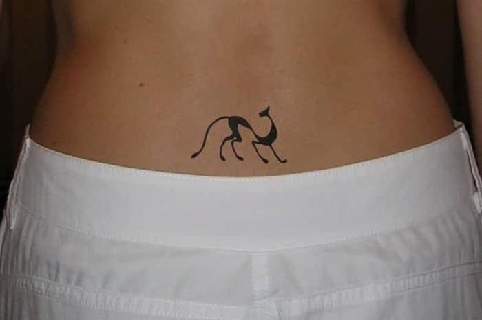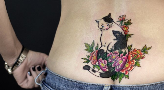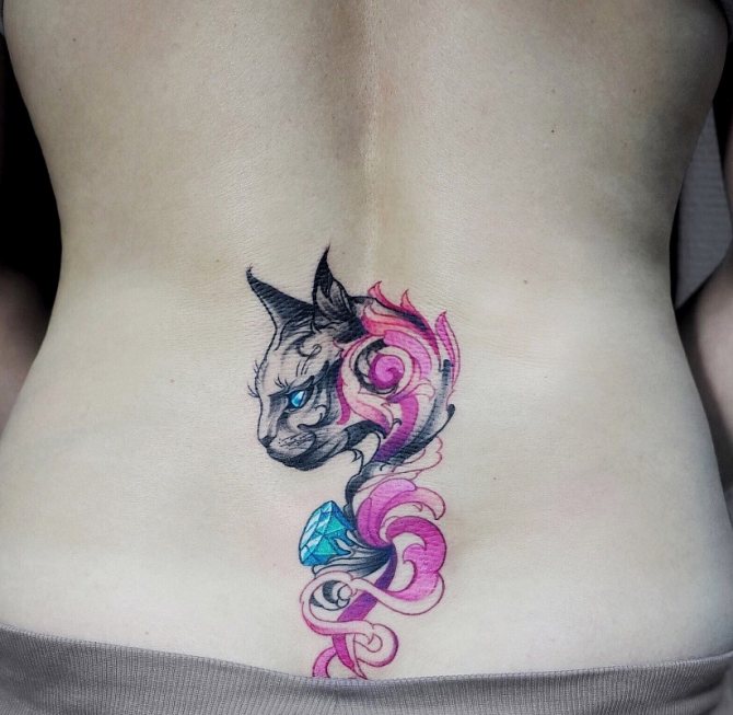 Tattoo in Form einer Katze auf ein spezielles Konto bei Mädchen. Solche Motive sind bei der Wahl einer Tätowierung auf dem unteren Rücken durchaus üblich. Sie sehen attraktiv und interessant aus. Eine Katze symbolisiert Anmut, Beweglichkeit, Schönheit, Mystik, Weiblichkeit und Unabhängigkeit ihrer Besitzerin. Es ist nicht unüblich, das Design mit Inschriften in verschiedenen Sprachen zu kombinieren. Ein solches Element verleiht der Körperkunst Geheimnis und Geheimhaltung.