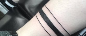 Die Linien können in der gleichen oder in verschiedenen Farben eingefärbt werden, die unterschiedliche Bedeutungen haben. Die Streifen können auch in der Länge oder Breite variieren, je nach persönlicher Vorliebe: Dies ändert jedoch nichts an der Bedeutung des Musters. Im Folgenden finden Sie die besten Ideen für Tattoos für Männer und Frauen in Form von Armbändern.