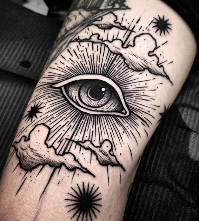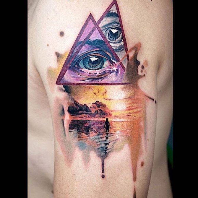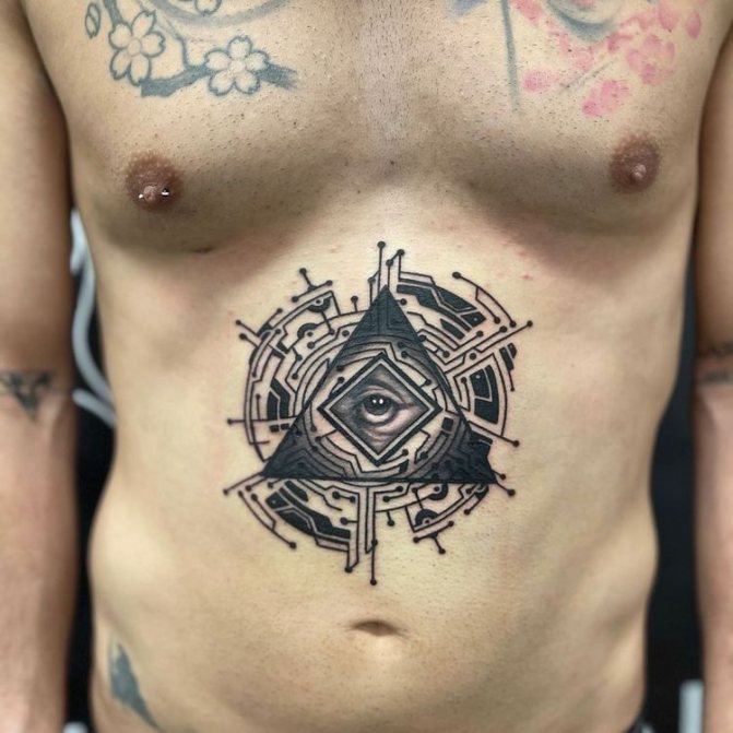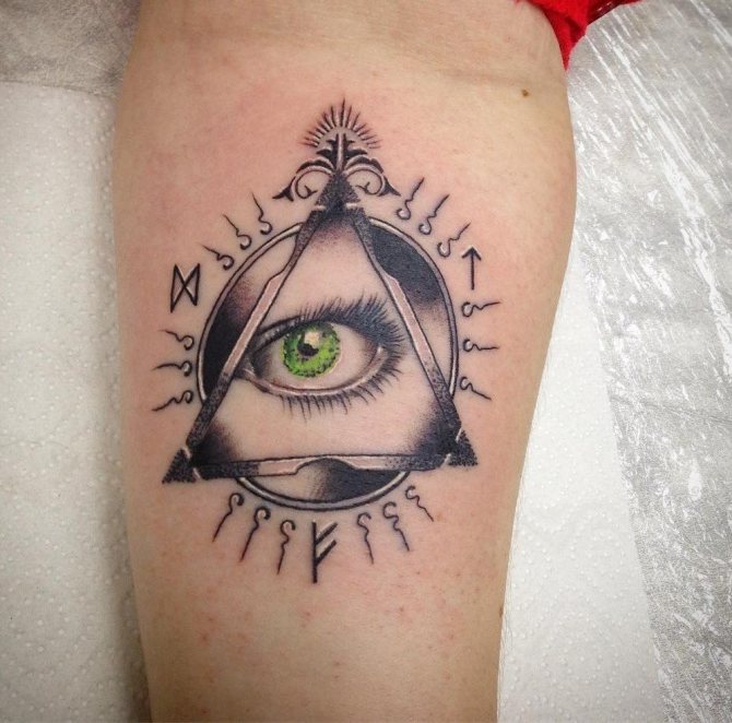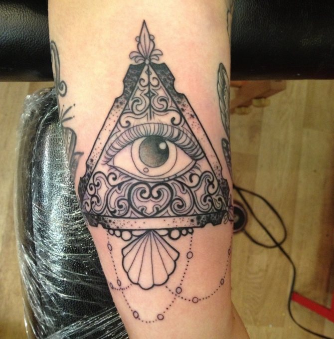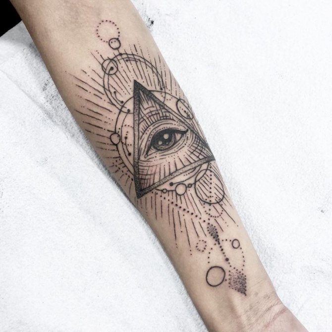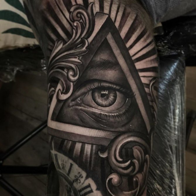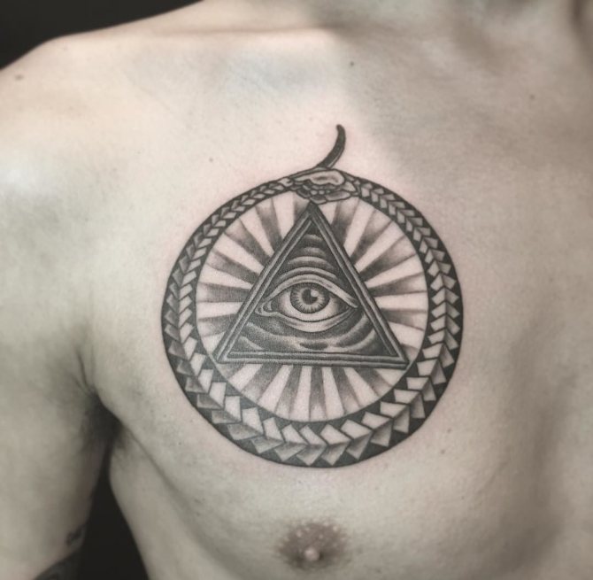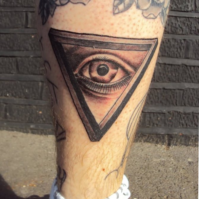 Eine andere originelle Art der Tätowierung wäre das Bild eines Auges in einem Dreieck. Dieses Symbol ist in vielen Kulturen zu finden und verweist oft auf Menschen, deren Glaube eine besondere Rolle in ihrem Leben spielt. Das Auge kann entweder in ein Dreieck eingeschrieben oder vor einer Pyramide positioniert sein. Alternativer Name - das Auge von Gore, im Allgemeinen ist das Tattoo ein Symbol für den göttlichen Anfang.