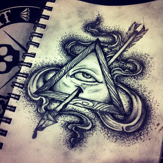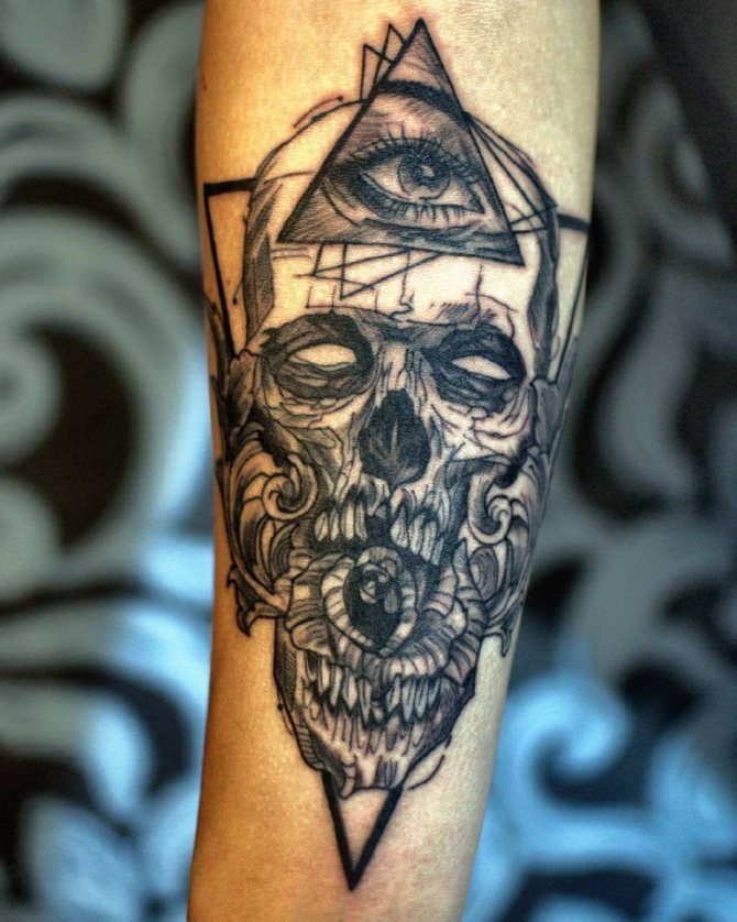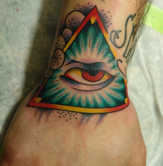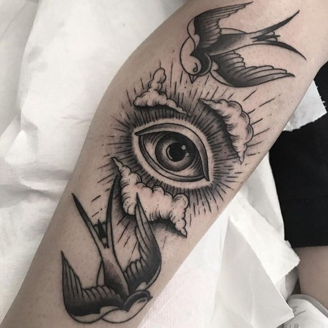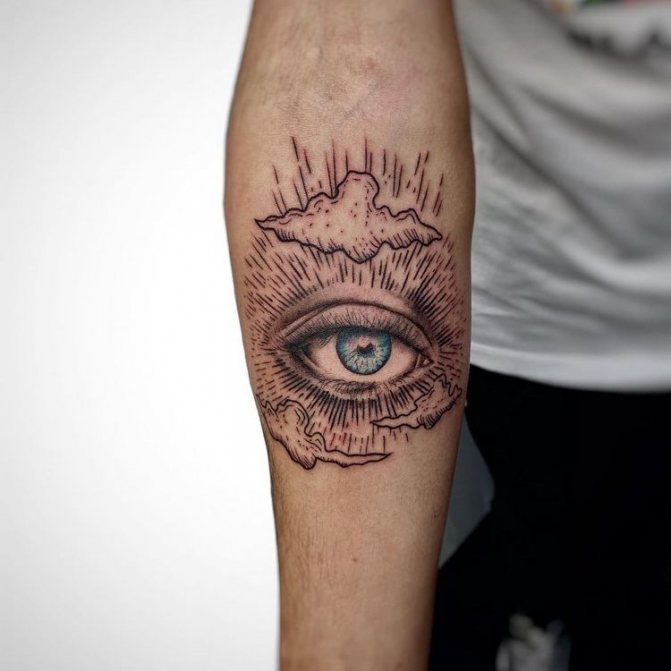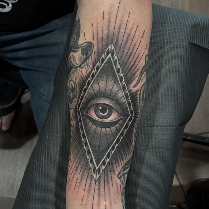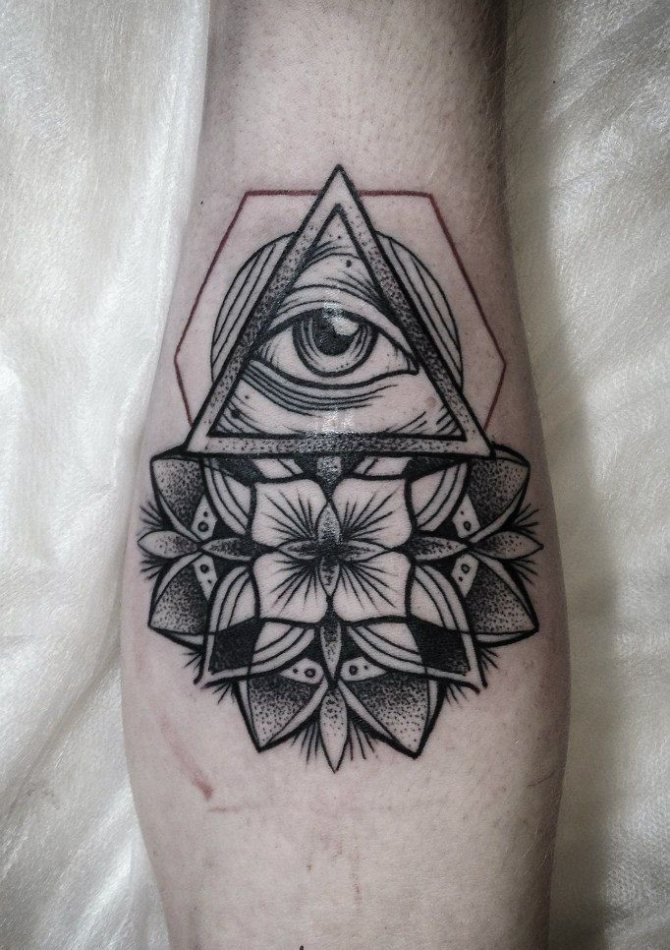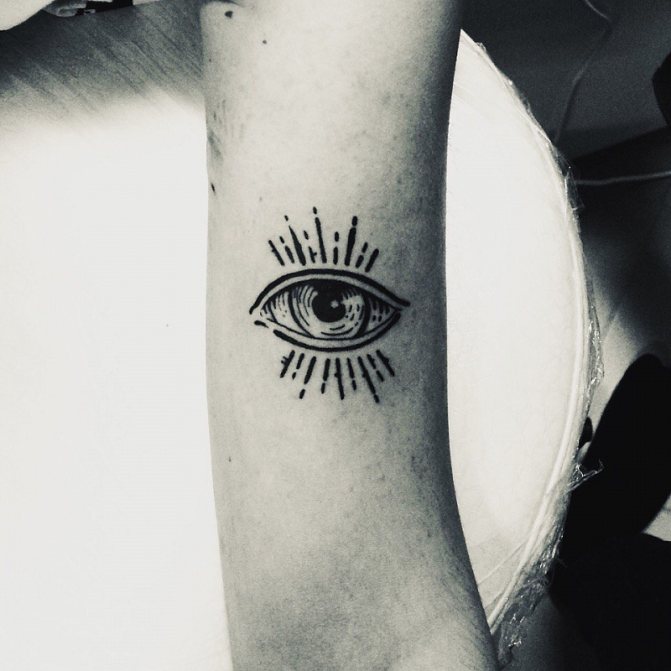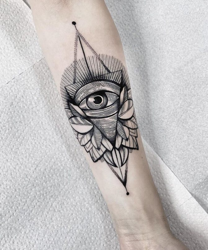 Eine andere originelle Art der Tätowierung wäre das Bild eines Auges in einem Dreieck. Dieses Symbol ist in vielen Kulturen zu finden und verweist oft auf Menschen, deren Glaube eine besondere Rolle in ihrem Leben spielt. Das Auge kann entweder in ein Dreieck eingeschrieben oder vor einer Pyramide positioniert sein. Alternativer Name - das Auge von Gore, im Allgemeinen ist das Tattoo ein Symbol für den göttlichen Anfang.