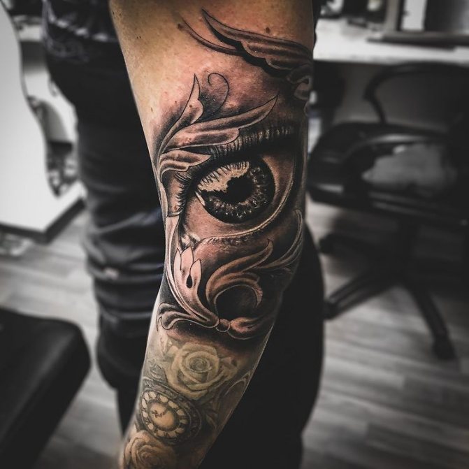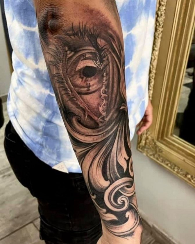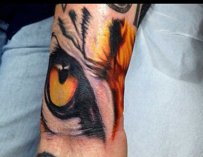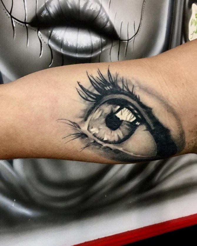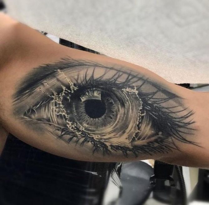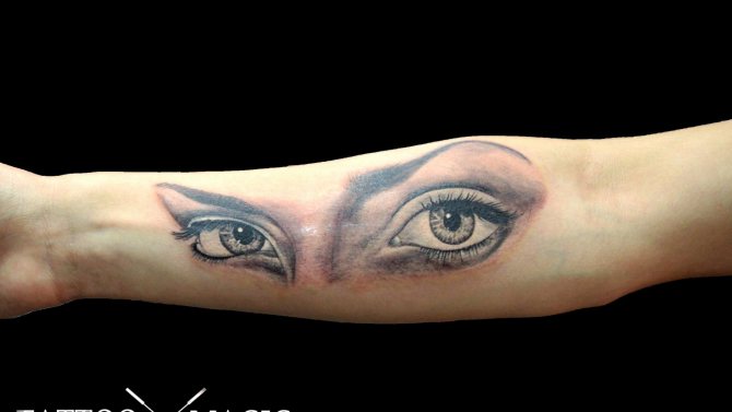 Fotos von furchteinflößenden Tätowierungen zeigen Augen von Tieren oder Reptilien, einen Drachen oder Fabelwesen. Sie können ein realistisches oder fantastisches Aussehen haben. Die Augen des Mädchens stehen für die Treue zu einem ewigen Geliebten. Das Auge des Horus, eine Gottheit mit einem Falkenkopf, zeichnet sich durch eine langgestreckte Form mit einer Augenbraue und einer Locke am unteren Ende aus - eine Darstellung des Sieges.