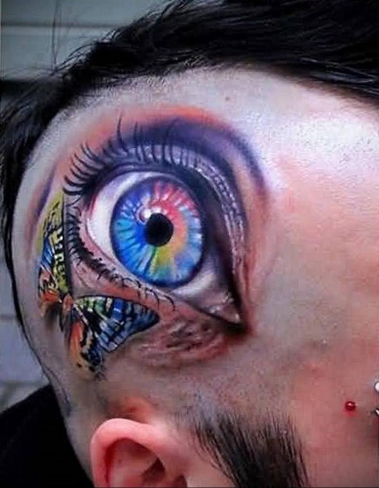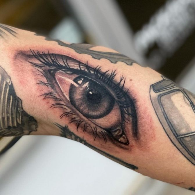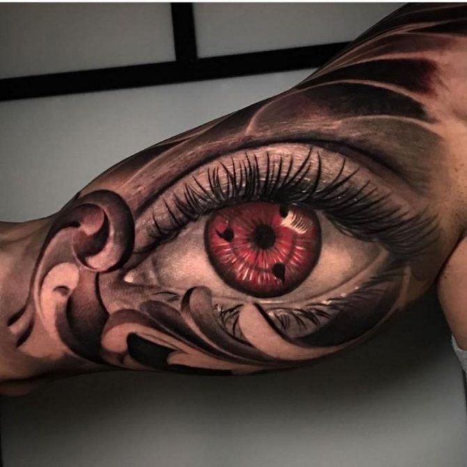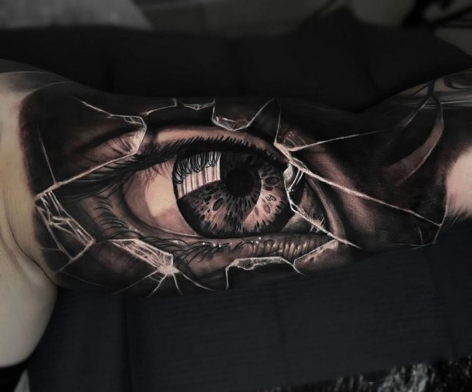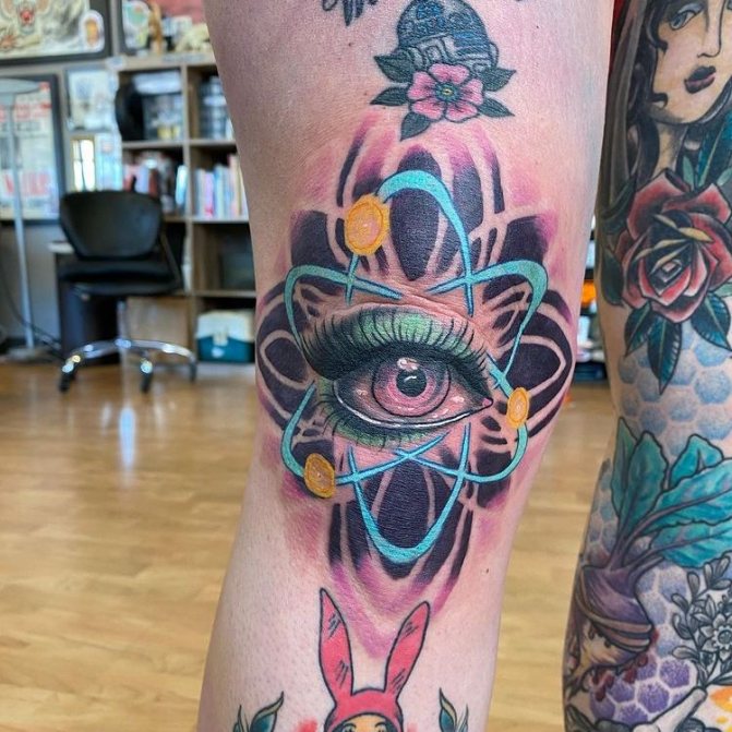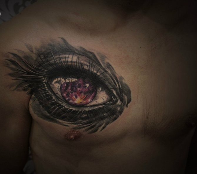 Brustkorb. In diesem Fall ist das Auge in erster Linie nur Teil der Komposition. Solche Tätowierungen sind überwiegend in Farbe. Die Umgebung der Symbole ist meist abstrakt gestaltet, in Form von Farben, geometrischen Figuren oder biomechanischen Elementen. Das Auge ist in der Mitte abgebildet, als der Brennpunkt, der die Aufmerksamkeit auf sich zieht.