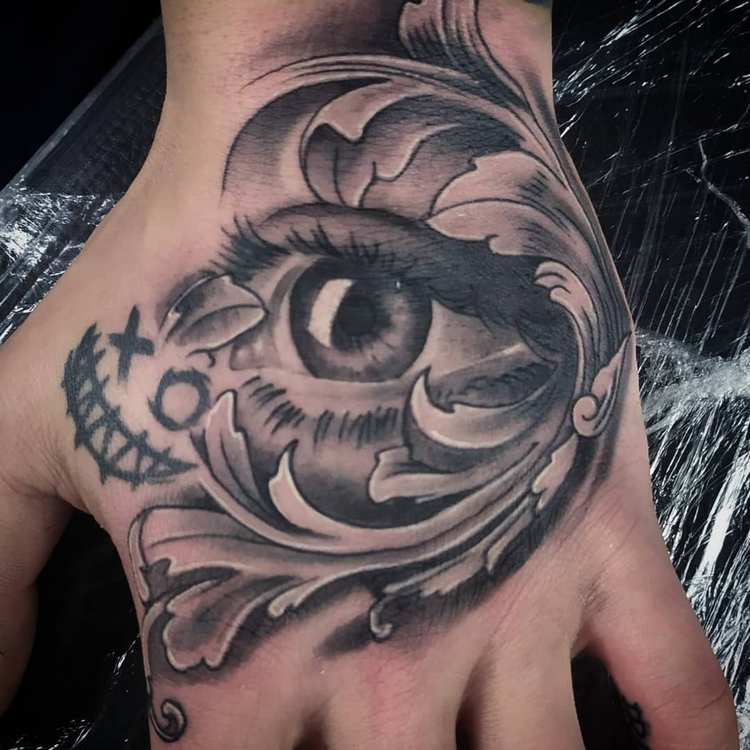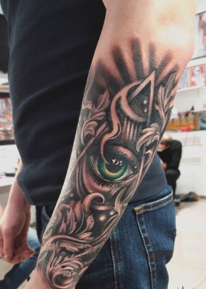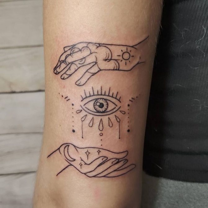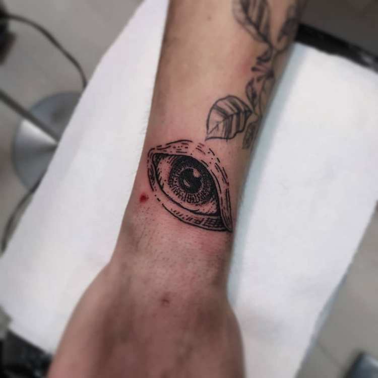 Die Handgelenke. Auch eine beliebte Stelle für eine augenförmige Tätowierung. Der Entwurf selbst ist klein. Manchmal wird eine Tätowierung angebracht, um Narben, Schnitte und die so genannten "Fehler der Jugend" zu verbergen. Das Auge ist oft in ein Pentagramm oder Hexagramm eingeschrieben, um dem gesamten Design einen okkulten Charakter zu verleihen. Das Auge ist häufig auch auf der Außenseite des Unterarms eingraviert. Die Bedeutung der Tätowierung ist im Wesentlichen dieselbe, aber die Tätowierung ist an dieser Stelle besser sichtbar als am Handgelenk.
