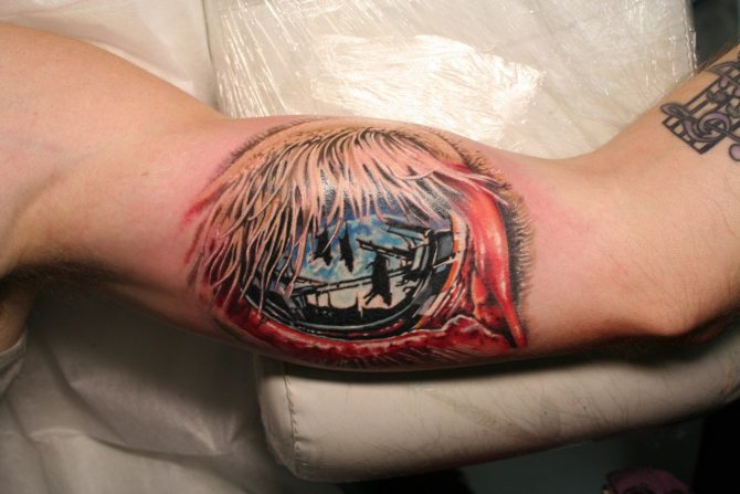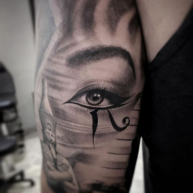 Derzeit ist die beliebteste Option für die Tätowierung ist das Auge eines der Götter des alten Ägypten, nämlich "Eye of Ra" oder "Eye of Horus. In Ägypten gab es den Mythen und Legenden zufolge einen erbitterten Kampf zwischen Horus und Seth um den Thron. Glaubt man ihnen, so war Horus' linkes Auge der Mond und sein rechtes Auge die Sonne. Bei einem der Kämpfe verlor er sein linkes Auge, das er später wiederherstellen konnte, allerdings nur teilweise. Der Gott selbst wird auf allen Gemälden mit dem Kopf eines Falken dargestellt, sein Auge symbolisiert den Sieg, ist seine direkte Verkörperung.