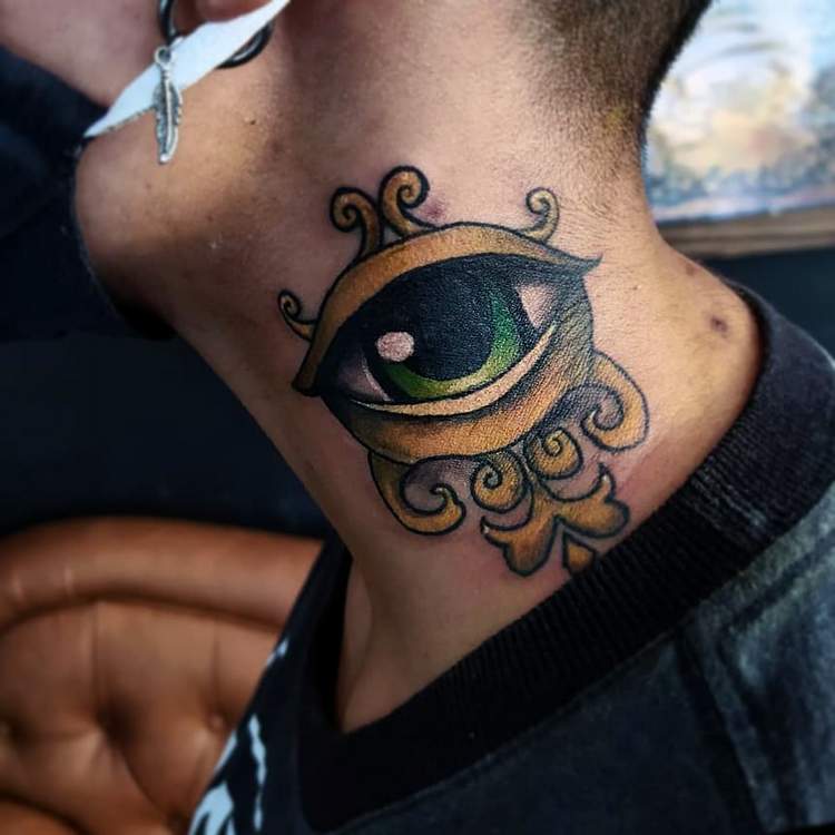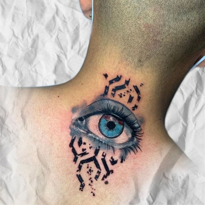 Kehle. Der schmerzhafteste Bereich der Anwendung, aber nicht weniger beliebt. Meistens wird nur das Auge selbst gezeichnet, als geheimnisvolles Symbol, das keine besondere Bedeutung hat. Das Muster kann auch Flügel oder einen Stacheldraht enthalten. Der Bereich um den Adamsapfel gilt als der schmerzhafteste, aber die meisten jungen Menschen lassen sich davon nicht abschrecken.