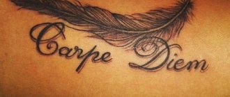 Eine Inschrift mit tiefer philosophischer Bedeutung sollte nicht nur an die Einstellungen und Prioritäten des Lebens erinnern, sondern auch das Auge erfreuen und eine dekorative Form haben. Auf diese Weise wird das Bild nicht nur mit einer enormen semantischen Bedeutung gefüllt, sondern zieht auch durch seine Schönheit und originelle Variation nicht nur seinen Besitzer, sondern auch die Menschen um ihn herum an. Es ist nötig zu bemerken, dass, die Tötowierung auf dem Latein qualitativ unter der Kraft nicht jedem Meister zu erfÃ?llen, deshalb bevor den Satz auf den Körper zu setzen muss man Ã?berzeugt sein, dass der Tötowierer die Aufgabe bewÃ?ltigen wird, sein Portfolio der fertigen Arbeiten durchgesehen.