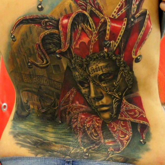 Ein Bild eines Narren hilft auch, Narben, Flecken und Striemen vor neugierigen Blicken zu verbergen. Es ist wichtig, einen erfahrenen Meister zu wählen, der nach Ihren Wünschen und Vorstellungen die richtige Skizze aufnimmt.