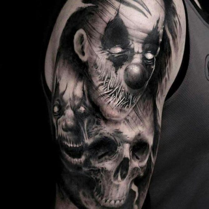 - Der Kopf eines toten Clowns. Die Tätowierung ist ein Symbol des Bösen, der Furchtlosigkeit, der Unsterblichkeit und der Zerstörung.