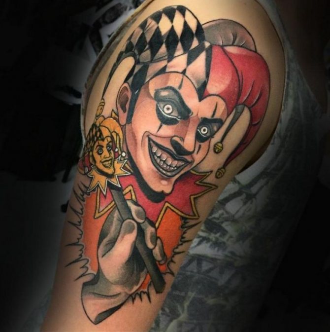 Stil und Buntheit von Tattoos mit Clowns, Gauklern