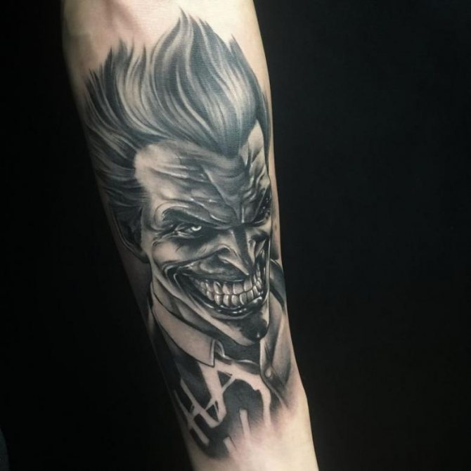Ein Joker-Tattoo auf dem Arm sieht in Form eines Ärmels spektakulär aus. Die Schultern, Unterarme, Bizeps oder Handgelenke eignen sich für eine nicht allzu große Tätowierung.