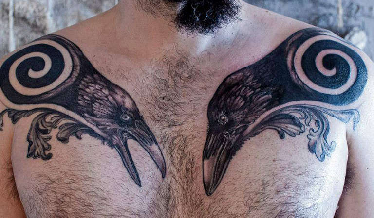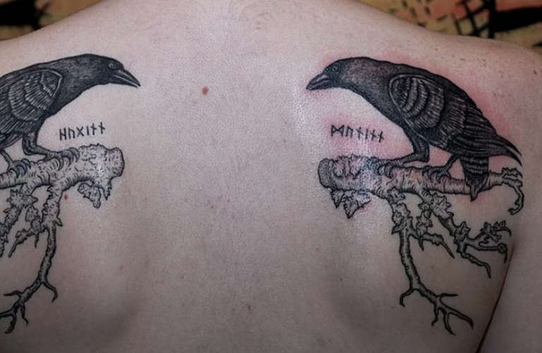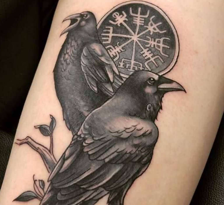 Raben Hugin und Munin - Vögel sind in der skandinavischen Mythologie ein Symbol für Metaphern, Gedanken und Erinnerungen. So spricht das Tattoo von der Suche nach sich selbst, der Reflexion und der Entdeckung der Wahrheit.