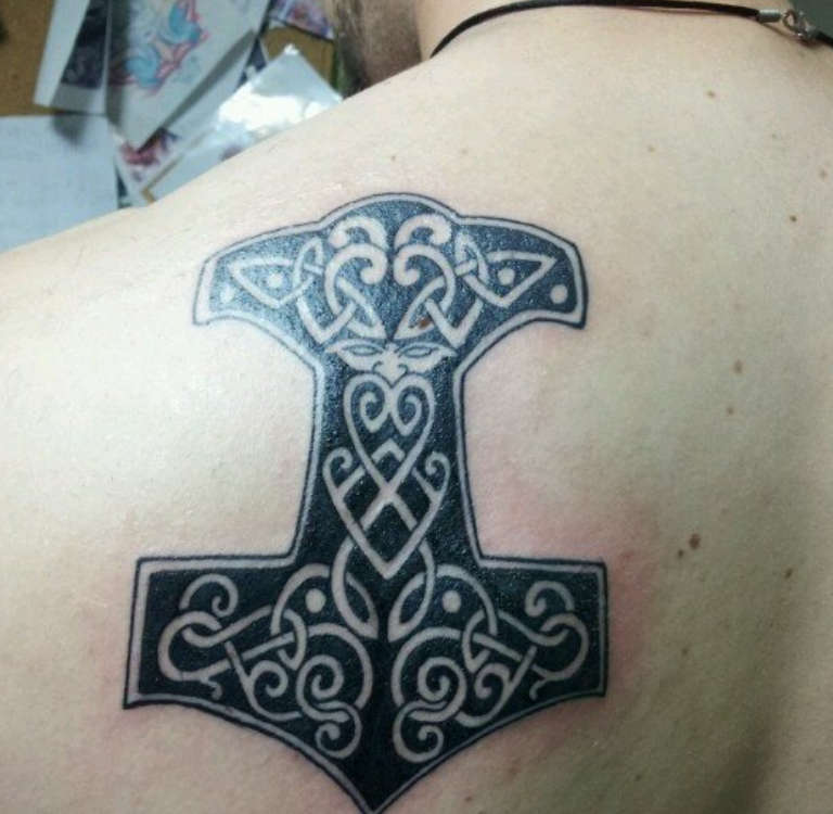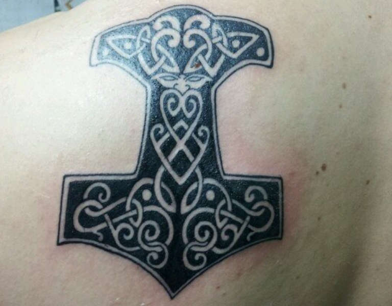 Thors Hammer - Eine Tätowierung dieses Formats ist ein mächtiger Talisman, da der Träger unter der Schirmherrschaft von Odins Sohn Thor steht. Wörtlich bedeutet die Tätowierung Zerstörung und Schöpfung, denn der Hammer kann sowohl töten als auch wieder auferstehen lassen.