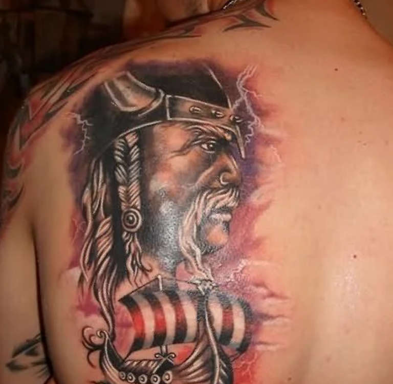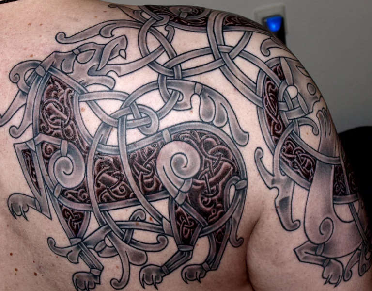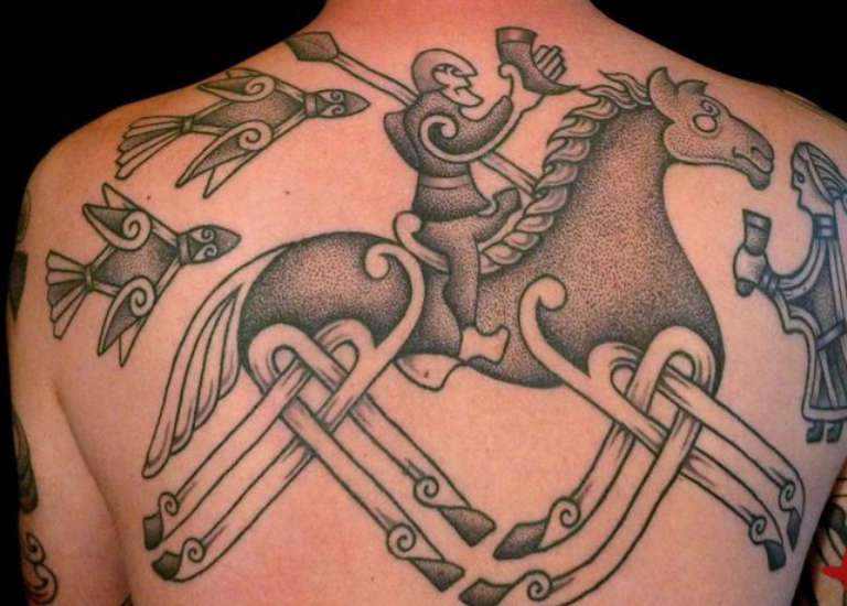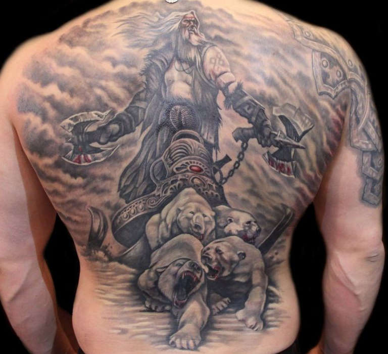 Der Rücken ist die geräumigste Leinwand für Tattoos, hier werden in der Regel große Motive und ganze Kompositionen angebracht. Götter, Krieger, wilde Tiere und Vögel sind hier angebracht und Runen und antike Inschriften können die Bedeutung und Wirkung der Tätowierung verstärken.