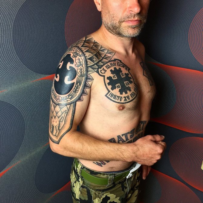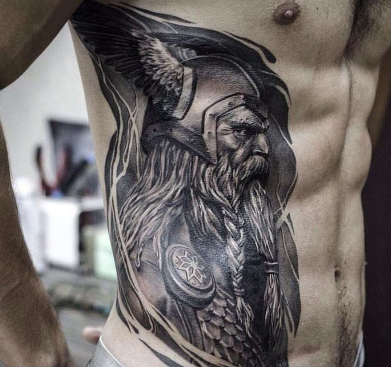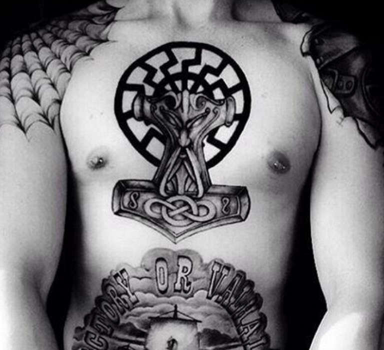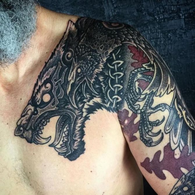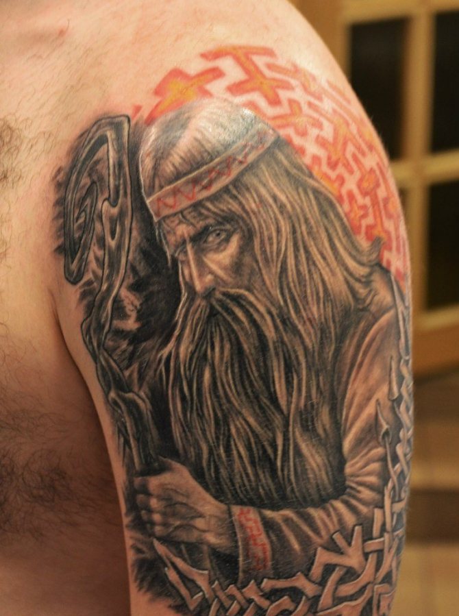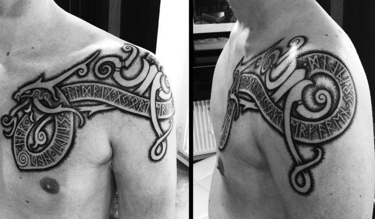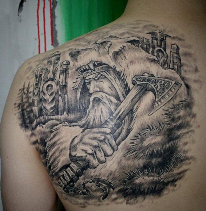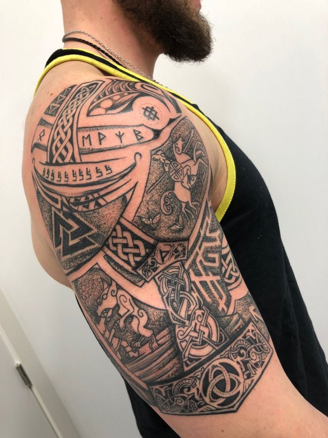 Für manche Männer sind die skandinavische Mythologie und Tätowierungen in diesem Stil ein integraler Bestandteil eines brutalen und kämpferischen Images. Die Praxis zeigt, dass Runen, Götter, mythische Figuren und Muster den Menschen Kraft und Zuversicht geben.