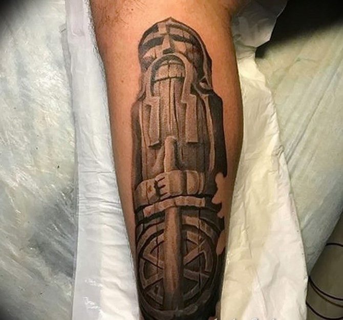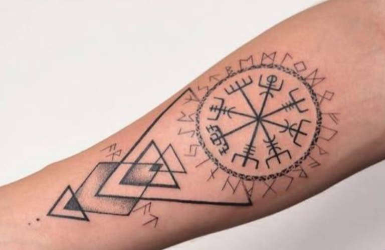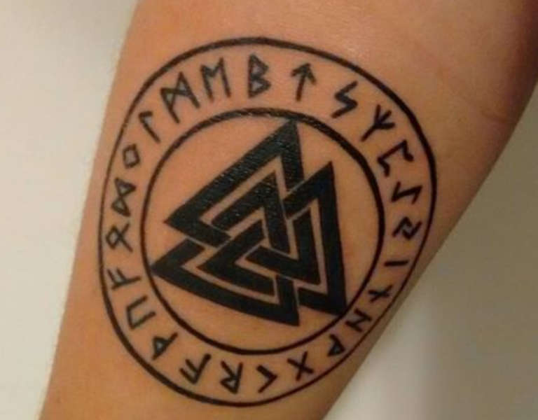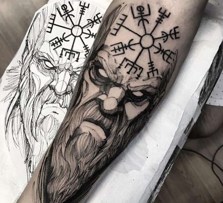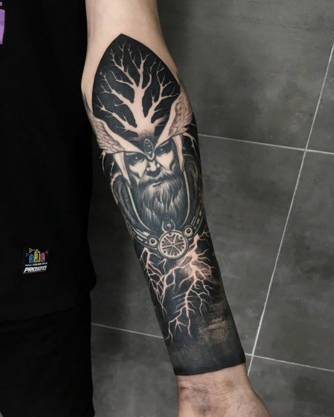 Skandinavische Motive auf dem Unterarm sind eine vielseitige Option für eine mittelgroße Tätowierung. Es kann ein Bild von magischen Runen, nordischen Gottheiten oder verschiedenen skandinavischen Themen aus der Mythologie sein.