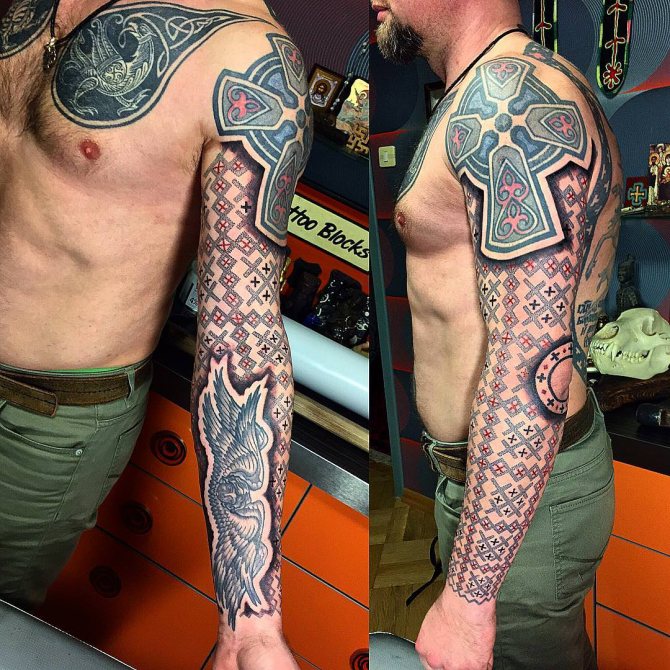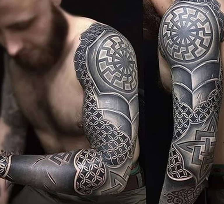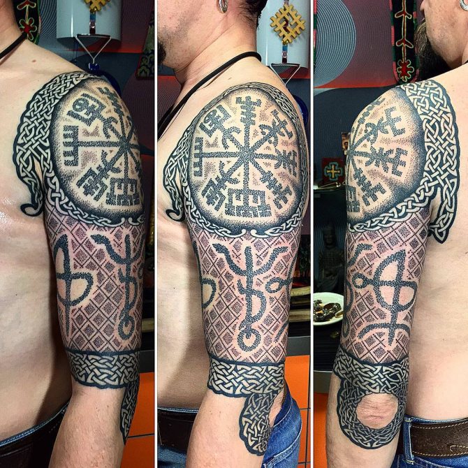 Ärmel ist eine Tätowierung auf der Hand, die die Skizze vollständig überlappt. Der Ärmel ist meist eine komplexe Komposition aus einer Kombination von Runen und Ornamenten. Ihnen werden Gesichter von Göttern und verschiedenen mythischen Figuren hinzugefügt.