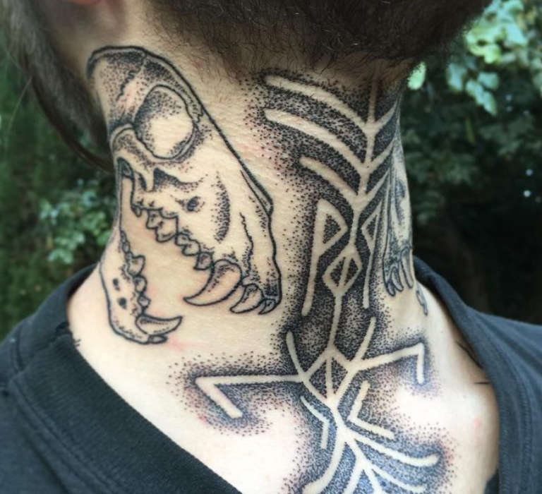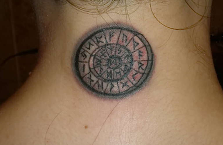 Auf dem Hals entsprechende kleine Tätowierungen mit tiefer heiliger Bedeutung. Wählen Sie vorzugsweise Runen, Inschriften, Muster, die als Amulette und Talismane wirken, weil sie härter wirken, wenn sie in der Nähe des Kopfes platziert werden.
