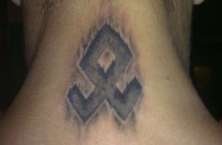 Zwei gekreuzte Achsen - Symbol für Macht und Stärke, Schöpfung und Schutz vor Feinden, den Wunsch, ein Haus zu bauen und eine Familie zu gründen. Die Tätowierung ist ein Hinweis auf die Zuverlässigkeit eines Partners fürs Leben.