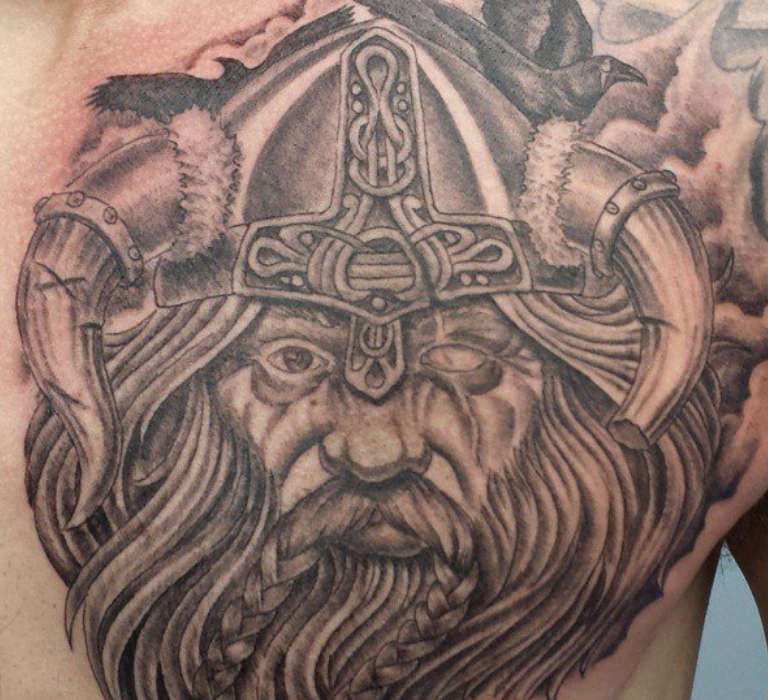 Auf der Brust ästhetisch ansprechend und maskulin aussehen künstlerischen Mustern - Krähen, wilde Tiere, beliebte Charaktere und Gottheiten aus der nordischen Mythologie.