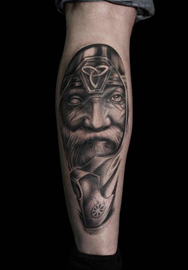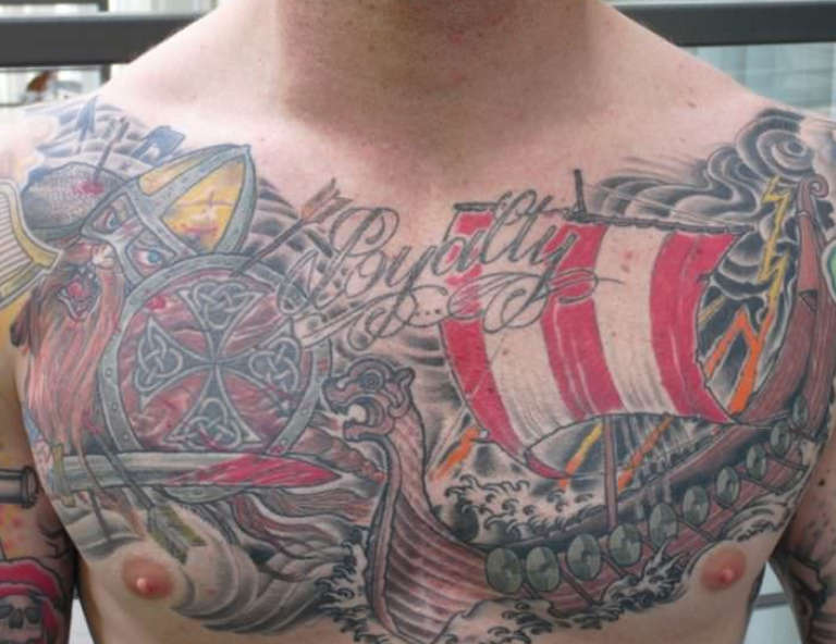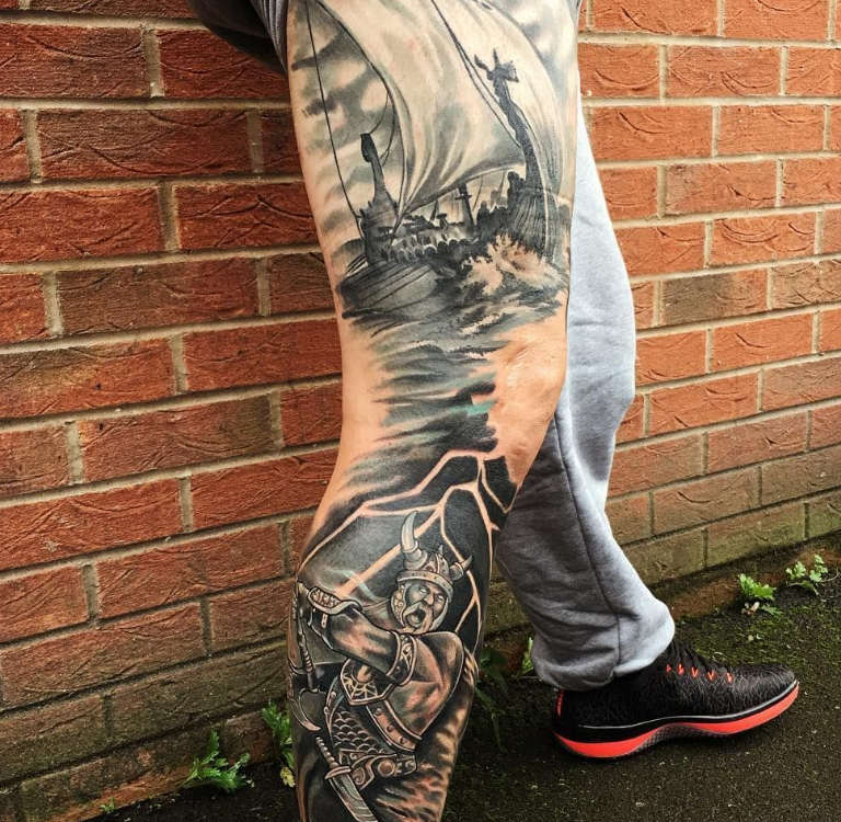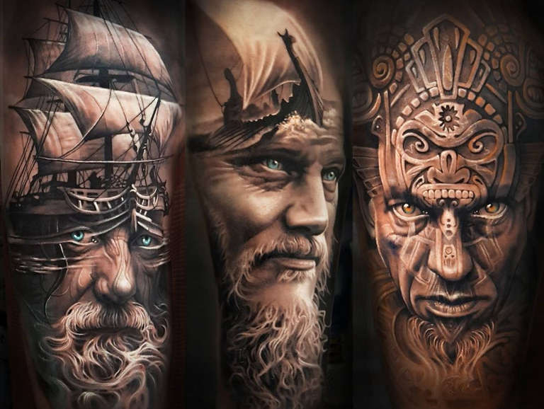 Die Tätowierer arbeiten sehr genau, um die schön geformten Muskeln, die geflochtenen Bärte und die anmutigen Linien eines Schildes oder Helms einzufangen. Dazu tragen auch die vielen Fotos von echten Waffen oder Rüstungen bei, die als hervorragende Beispiele dienen.