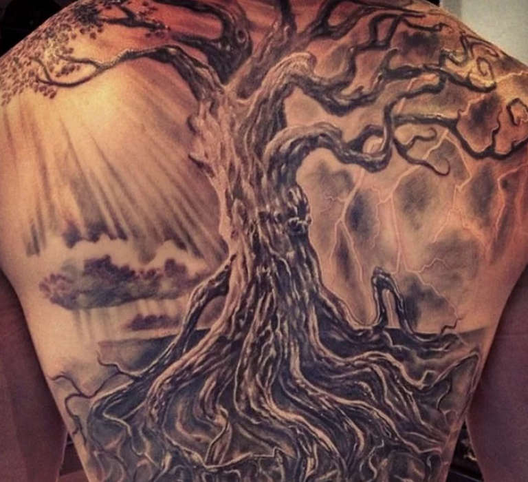 Der große Baum Yggdrasil, der die Quelle des Lebens in der Welt ist, kann auf jedem Teil des Körpers eingraviert werden. Die naturalistische oder symbolische Darstellung steht für eine Quelle unendlicher Weisheit und Unerschütterlichkeit, für den Glauben an die Quelle ewiger Weisheit und Macht, für Wissensdurst und Selbstfindung.