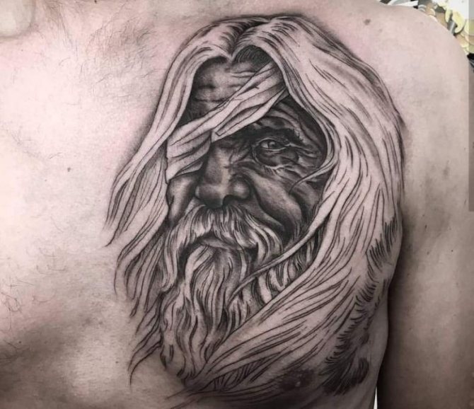 Eine - oberster skandinavischer Gott, der immer noch von vielen verehrt wird. Eine Tätowierung von Odin ist die Wahl eines Anführers, ein starker, mutiger und weiser Mann.