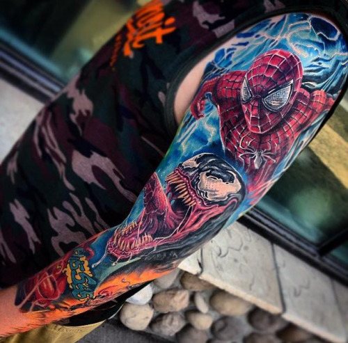 Für ein Marvel-Tattoo ist der New-School-Stil am besten geeignet. Aber wie bereits erwähnt, gibt es hier keine Tabus. Sagen wir, ein biomechanischer oder altmodischer Stil würde auch schick aussehen.