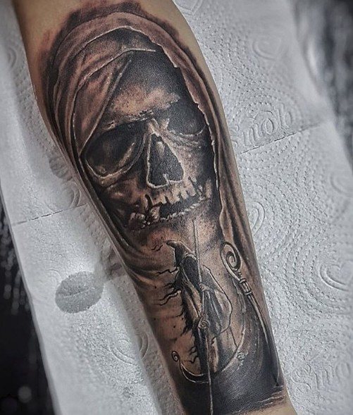 Einer der beliebtesten Stile für die Darstellung des Sensenmannes ist der Realismus. Die Hauptsache in dieser Richtung ist es, die Tätowierung so genau und ähnlich wie möglich zu machen, so dass es zu Recht als eine der schwierigsten in der Kunst des Tätowierens betrachtet wird. Skizzen in diesem Stil können farbig oder schwarz-weiß sein und es gibt keine Farbbeschränkungen. Die Farbpalette hängt nur von der Wahl des Kunden und der Vision des Künstlers ab. Im Realismus werden häufig Weißtöne verwendet, um Kontraste zu verstärken oder Details wie das Glitzern eines Auges, das Schimmern von Metall oder Wasser oder die Reflexion von Licht darzustellen. Eine Vielzahl von Figuren aus Spielen, Filmen, Comics, Büchern oder Mythen, Musiker oder Schauspieler sind die häufigste Wahl bei realistischen Arbeiten.