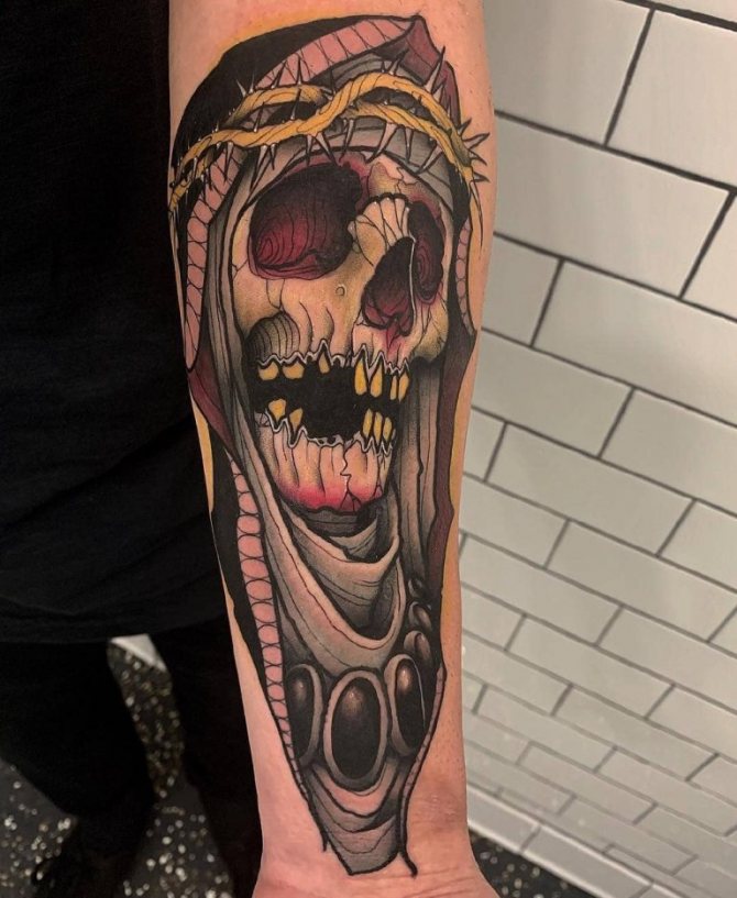 Tattoo Tod für Menschen mit starken Nerven, denn es gibt einen Glauben, dass verursacht, und das wird wahr werden. Diese Tätowierung flößt der Umgebung Schrecken, Angst und Furcht vor ihrem Besitzer ein. Typischerweise macht es die Menschen verzweifelt und gewürzt, die nicht eine Abteilung der Angst, auch vor der Meinung der anderen ist. Dennoch behandelt eine Person, die eine solche Tätowierung anbringt, diese wie einen Talisman.