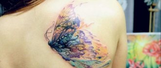Tätowierungen in diesem Stil sind auf dem Körper einer Frau nicht weniger auffällig, wenn das Bio-Organic-Tattoo auf einer größeren Fläche angebracht wird. In diesem Fall hat der Künstler die Freiheit, der Fantasie freien Lauf zu lassen und satte Farben, eine dichte Kolorierung und eine sorgfältige Studie der Umrisse von Pflanzen und Tieren zu wählen.