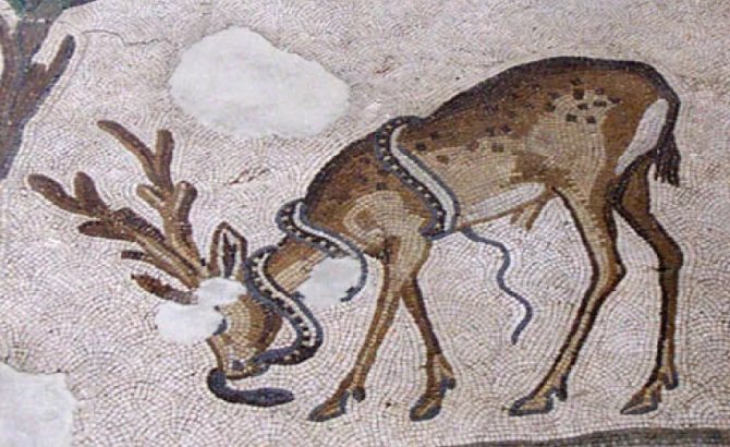 In der Antike hieß es, ein Rentier habe die Kraft um Schlangen zu vertreiben. aus ihren Löchern holen, sie töten und fressen (offenbar halten die Autoren dieser "Fabel" ein solches Verhalten für die beste Art, sich des Schlangenbabys zu entledigen).