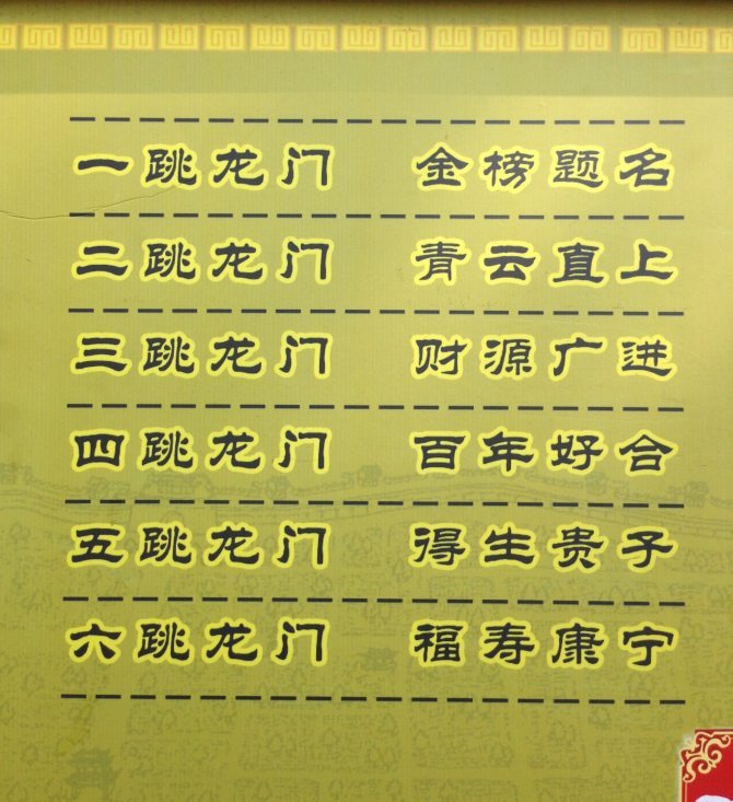 Der Wasserfall wird "Drachentor" genannt. Bis heute glaubt man, dass jeder "Koi", der genug Ausdauer hat, um nach oben zu klettern und die Kraft der Elemente zu überwinden, zu einem Himmelsdrachen wird.