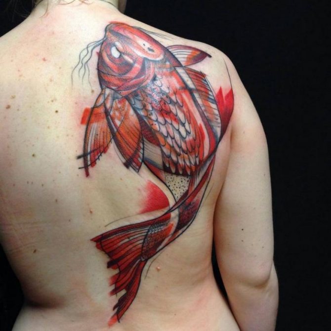 Die engere Bedeutung der Tätowierung Koi Karp wird durch die Einbeziehung zusätzlicher Elemente in das grafische Konzept erreicht. Die beiden Fische zum Beispiel symbolisieren eine harmonische Beziehung zwischen Partnern. Ein Karpfen mit einem Drachenkopf steht für ein starkes männliches Amulett. In diesem Fall verstärkt eine große mythische Figur die magische Kraft eines relativ kleinen Fisches, vervielfacht seine Energie und hat eine maximale Wirkung auf die Person mit der Tätowierung. Die beste Stelle für eine solche Tätowierung ist der Rücken oder der Arm. Ein wichtiger Punkt ist, dass der Fisch muss in einer geeigneten Umgebung für sie zu leben, weil (in Übereinstimmung mit den Grundsätzen des Feng Shui), wird es ein vollwertiger Talisman nur, wenn die Anwesenheit von Wasser. Der Hintergrund für den Koi-Karpfen sind daher häufig stilisierte Wellen.