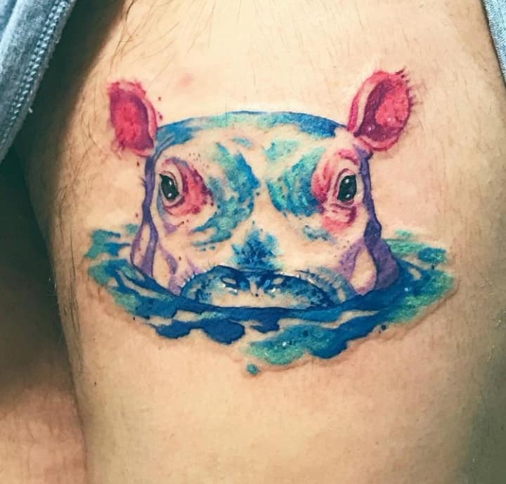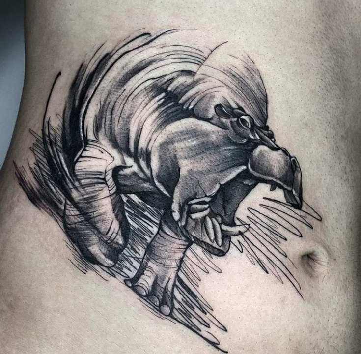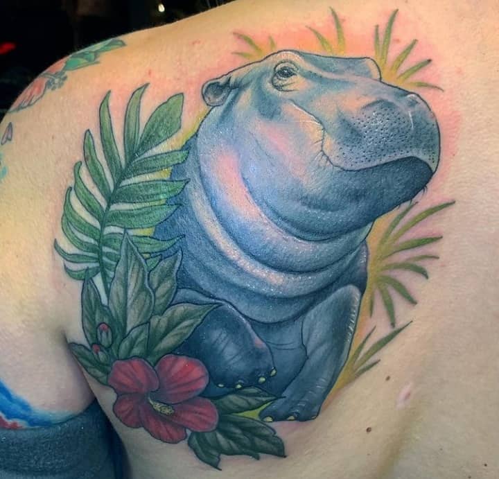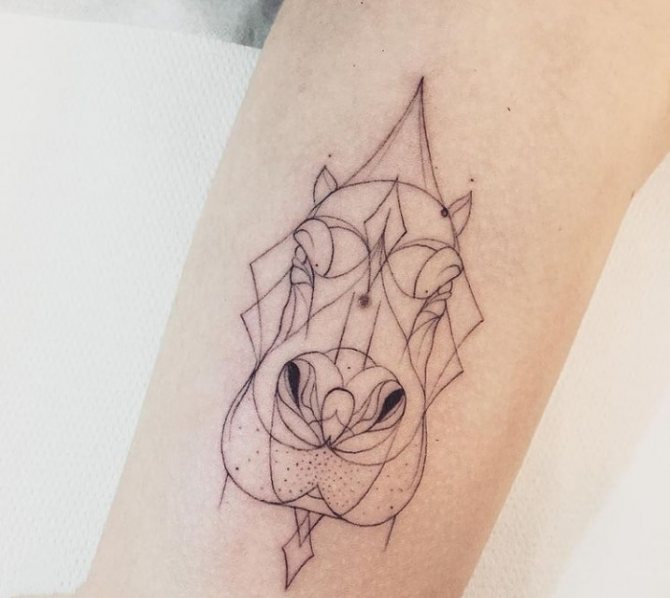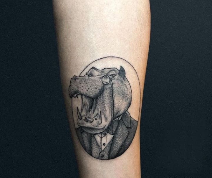 Bilder von Flusspferden begleiten den Menschen seit der Antike - gut erkennbare Silhouetten finden sich häufig in Felszeichnungen, Flachreliefs und Fresken, die bei archäologischen Ausgrabungen gefunden wurden. Die Macht dieses riesigen Tieres wurde mit den Elementen verglichen, gegen die der Mensch machtlos war, und seine imposante Erscheinung wurde sowohl respektiert als auch gefürchtet. In der modernen Gesellschaft war die dicke Haut des Tieres ein Symbol für Gefühlsarmut und Gleichmut, während seine enorme Größe auf Völlerei hindeutete. Die Tätowierung eines Nilpferdes steht für körperliche Stärke, Ruhe und ein fröhliches, unbeschwertes Gemüt.