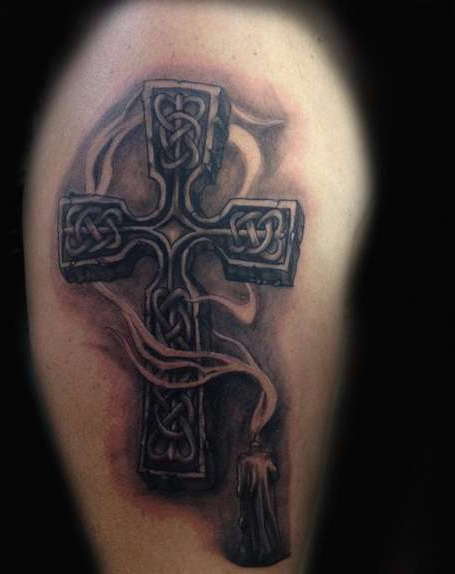 Kreuztattoo im keltischen Stil auf der Schulter