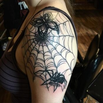Ein Ärmel in Form eines Spinnennetzes sieht auf dem Unterarm eines Mannes vorteilhaft aus und betont die Muskulatur. Spinnennetze auf den Schultern können eine gute Kulisse für alle Bilder sein.