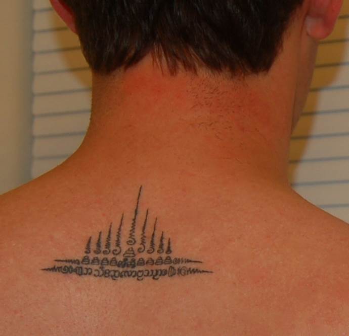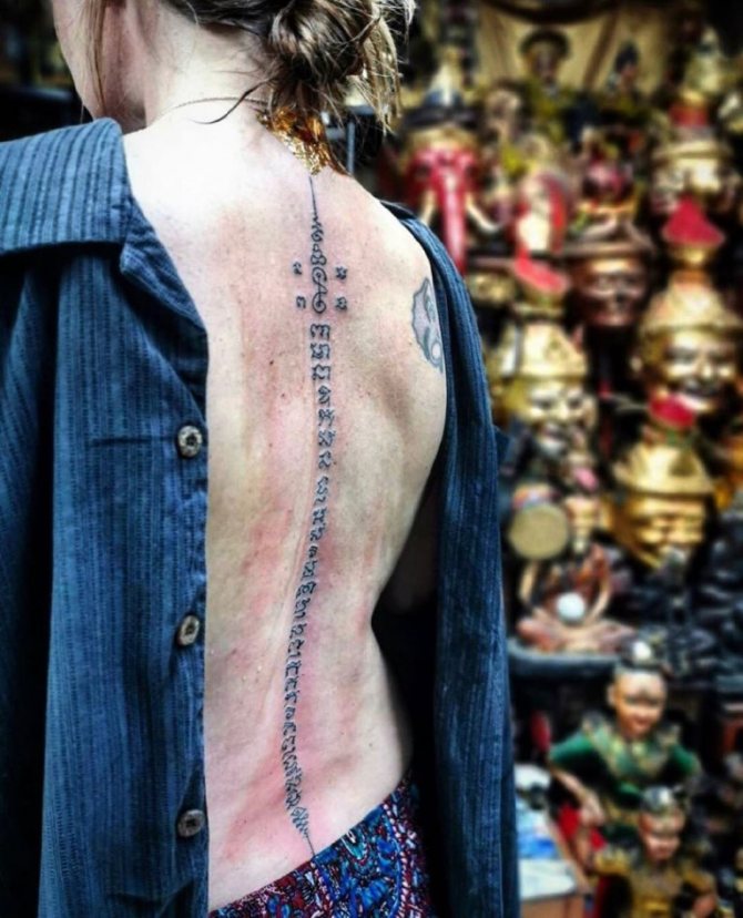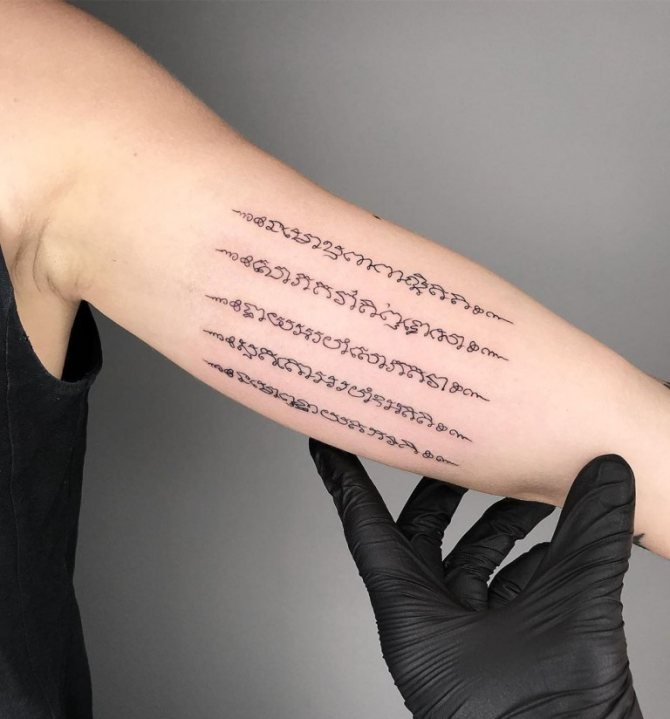 Die magische Tätowierung besteht aus Mantras in der Sprache Pali, die im nördlichen Teil Indiens praktiziert wird. Die Legende besagt, dass diese Region des Landes als Geburtsort des Buddha gilt, weshalb die alten Überlieferungen der buddhistischen Schule in dieser Sprache verfasst sind. Erwähnenswert ist, dass die Pali-Sprache keine eigene Schriftsprache hat: Sie wird durch Khmer-Zeichen ersetzt. In Übereinstimmung mit dieser Tatsache können wir sagen, dass Sak Yant eine Art Gebet der Khmer ist.