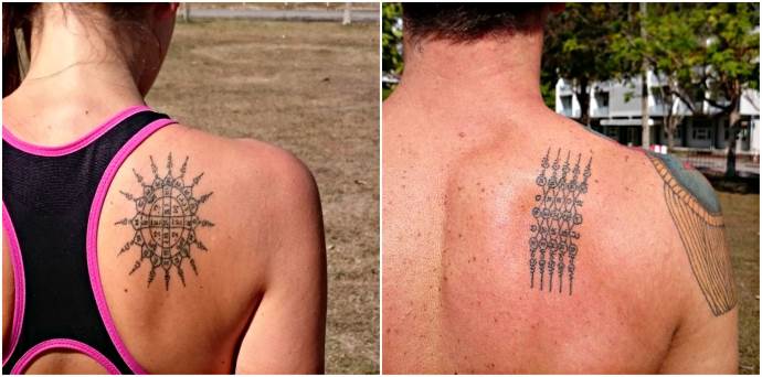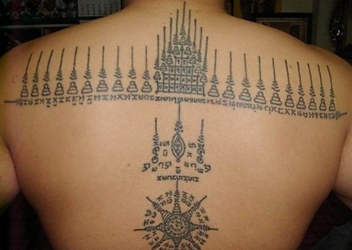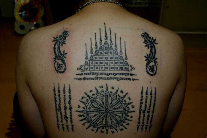 - Tam Kwaam - ein Symbol, das Glück anziehen und die eigenen Ziele dauerhaft erreichen soll (manchmal wird dieses Design mit schwarzer Magie in Verbindung gebracht und kann dem Zweck dienen, Ehepartner zu trennen oder einer Person Krankheit oder tödliche Gefahr zuzufügen);