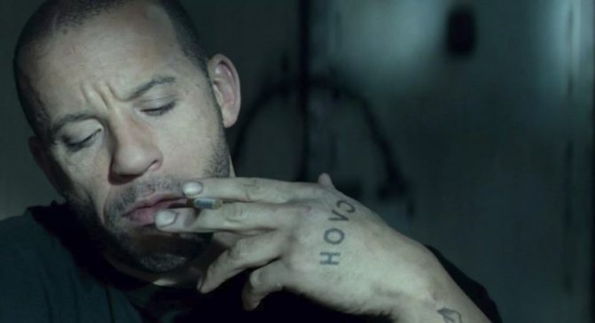 In einem anderen Film, in dem Vin Diesel die Hauptrolle spielt, sieht man ein Gefängnistattoo mit einer Abkürzung auf seinen Fingern. Auf der Seite des Schauspielers verschwand dieses Image sehr schnell, denn niemand möchte mit einem Gefängnisinsassen in Verbindung gebracht werden. Aber, so der Schauspieler, ein Blick auf das schreckliche Tattoo war genug, um sich in die Rolle zu stürzen.