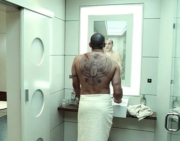 Doch bei näherer Betrachtung von Vin Diesels Tätowierung fällt auf, dass der Skarabäuskäfer etwas ausgefallen ist: Er hat eine Krone und seine Flügel sind von ägyptischen Hieroglyphen umgeben. Der Skarabäuskäfer hält auch den gesamten Planeten in seinen Klauen und steht für Weisheit und eine Art Geheimwissen.