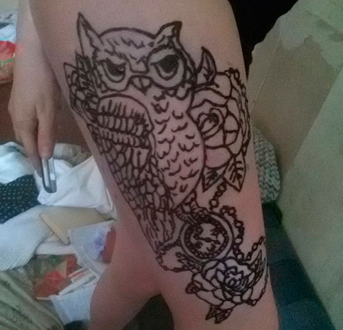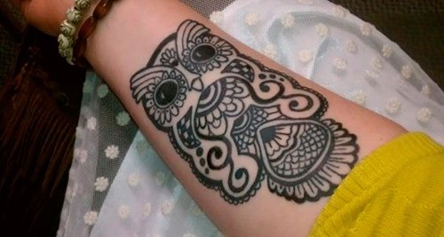 - Eule - Henna-Tattoo auf dem Arm in Form einer Eule symbolisiert Intelligenz, Kraft und Weisheit;