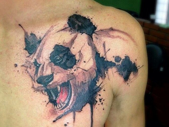 Die Stilistik, in der beliebte Tattoo-Skizzen "Panda" gemacht werden, kann erheblich variieren. Frauen bevorzugen zartere Varianten: Aquarellmalerei, Realismus. Männer bevorzugen einen aggressiveren Stil: