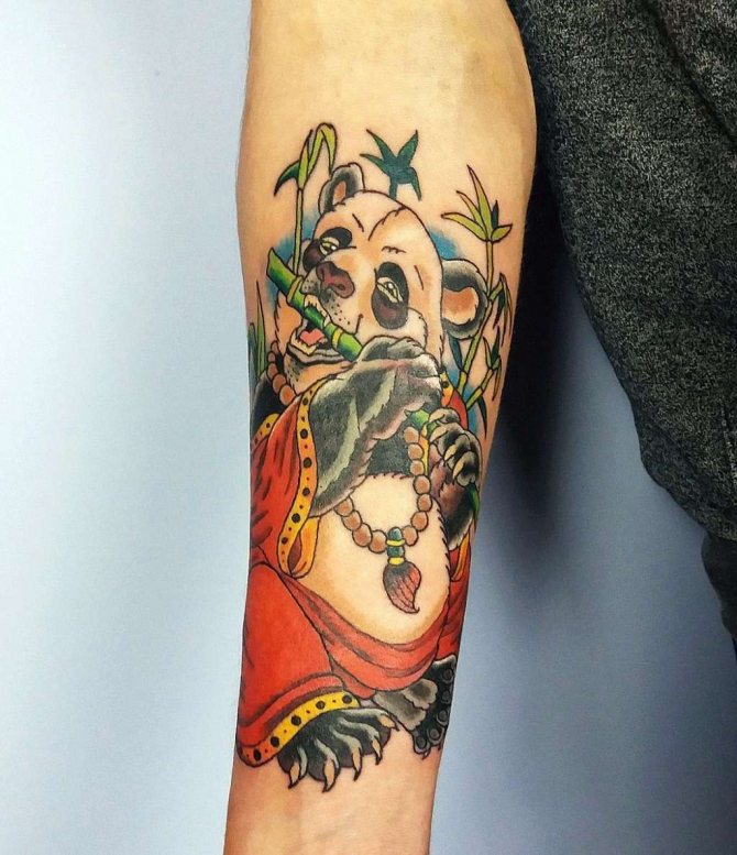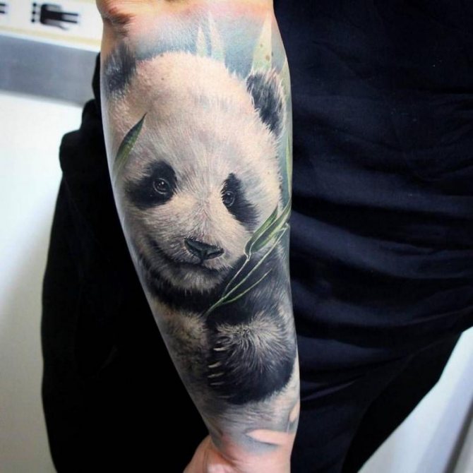 - Die Panda-Tätowierung auf dem Arm kann Teil des Ärmels oder auf dem Unterarm, Handgelenk platziert werden.
